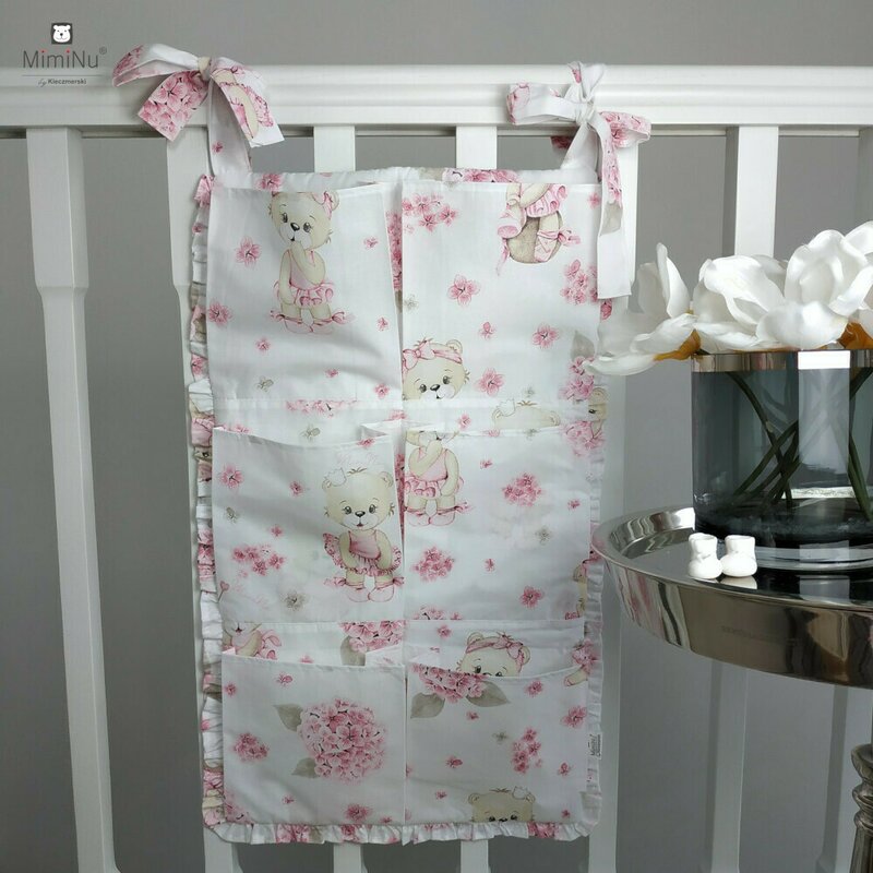 Organizator pentru patut, MimiNu, Din bumbac certificat Oeko Tex Standard 100, Cu 6 compartimente, Doua panglici, 70x40 cm, Cu volanase, Design, Pink Ballerina