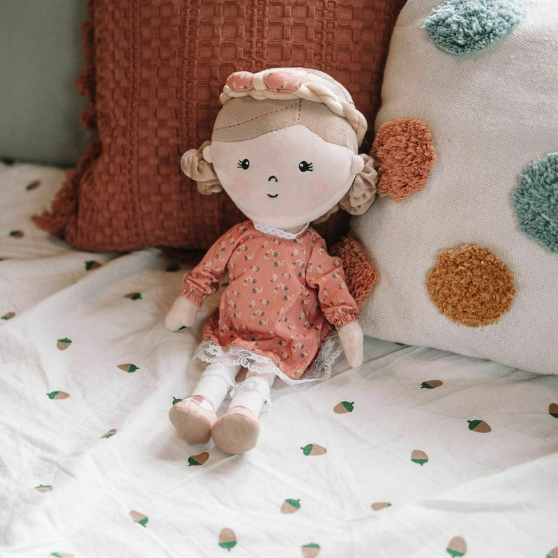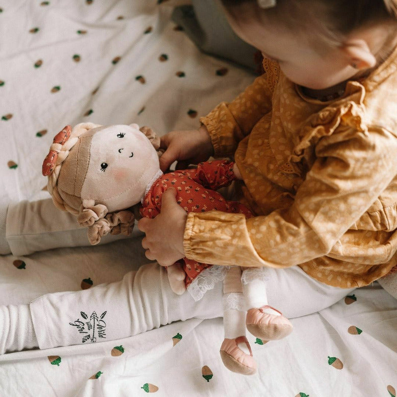 - Papusa este realizata dintr-un material foarte placut cu o rochie frumoasa, coafura perfecta si detalii de dantela. Daca se murdareste, o poti spala pur si simplu manual la 30°. Incurajeaza imaginatia si fantezia la copii si dezvolta abilitatile cognitive datorita diferitelor forme si texturi.