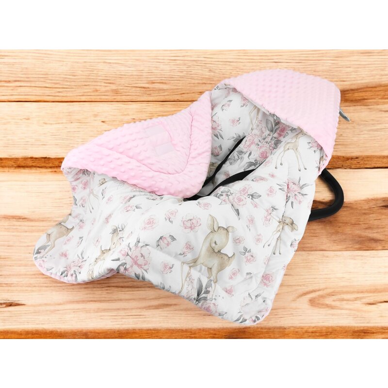 Paturica calduroasa de infasat, MimiNu, Pentru scoica, scaun auto/carucior, Cu gluga si urechi, Cu sistem de prindere pe baza de velcro, Dimensiune 90x90 cm, Din tesatura pufoasa Minky + Bumbac, Materiale certificate Oeko Tex Standard 100, Sweet Deer Pink