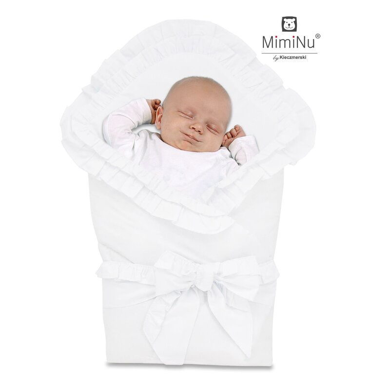 Paturica de infasat, MimiNu, Multifunctionala pentru botez, Cu volanase, Cu inchidere cu panglica si arici velcro, Dimensiune 75x75 cm, Din bumbac certificat Oeko Tex Standard 100, White
