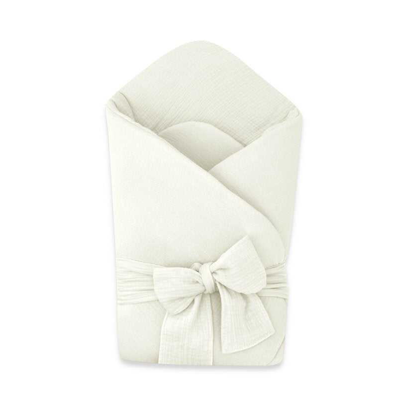 Paturica de infasat, Qmini, Din muselina dubla, Cu inchidere cu panglica, Dimensiune 75x75 cm, Din material certificat Oeko Tex Standard 100, Cream