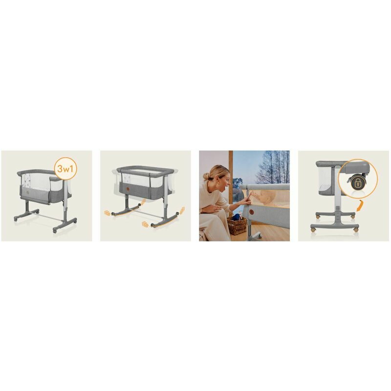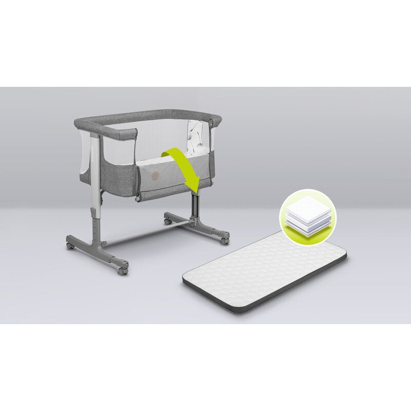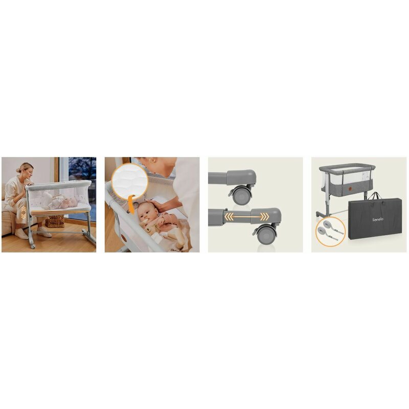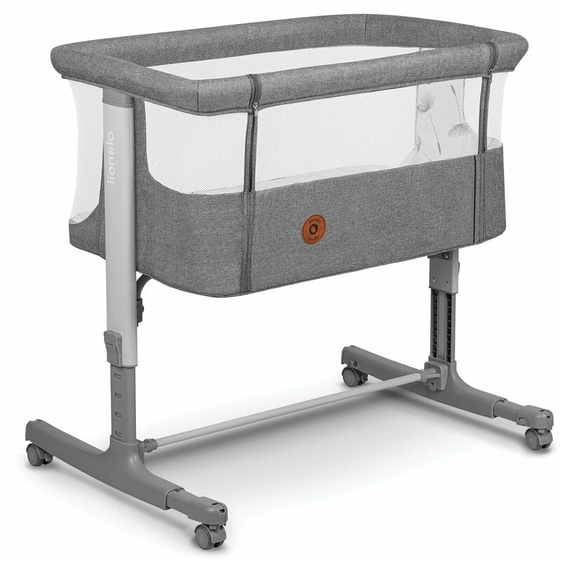 Patut co-sleeper, Lionelo, Aurora, 3 in 1, Cu leganare si setare unghiulara, Include saltea cu densitate T25 si geanta transport, Reglabil in 5 pozitii pe inaltime, Pana la 9 kg, 0 luni+, 85x60x66 cm, Conform cu EN 1130:2019+AC:2020, EN 16890:2, Gri