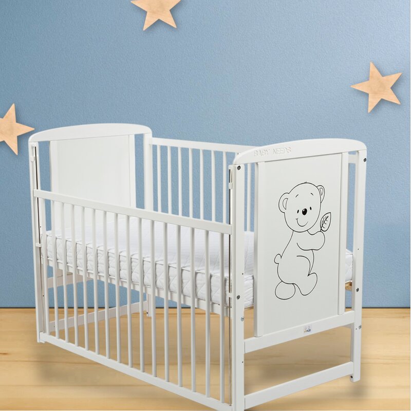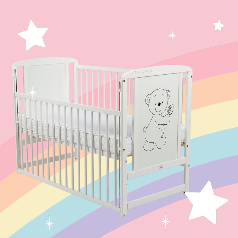 Patut din lemn bebe, 120x60 cm, Cu laterala culisanta, Din lemn de pin si mdf, Stabil si rezistent, Inaltime saltea reglabila pe 3 nivele, Laterala cu 3 bete detasabile, EN716-1, EN716-2, Alb, Babyneeds, Timmi