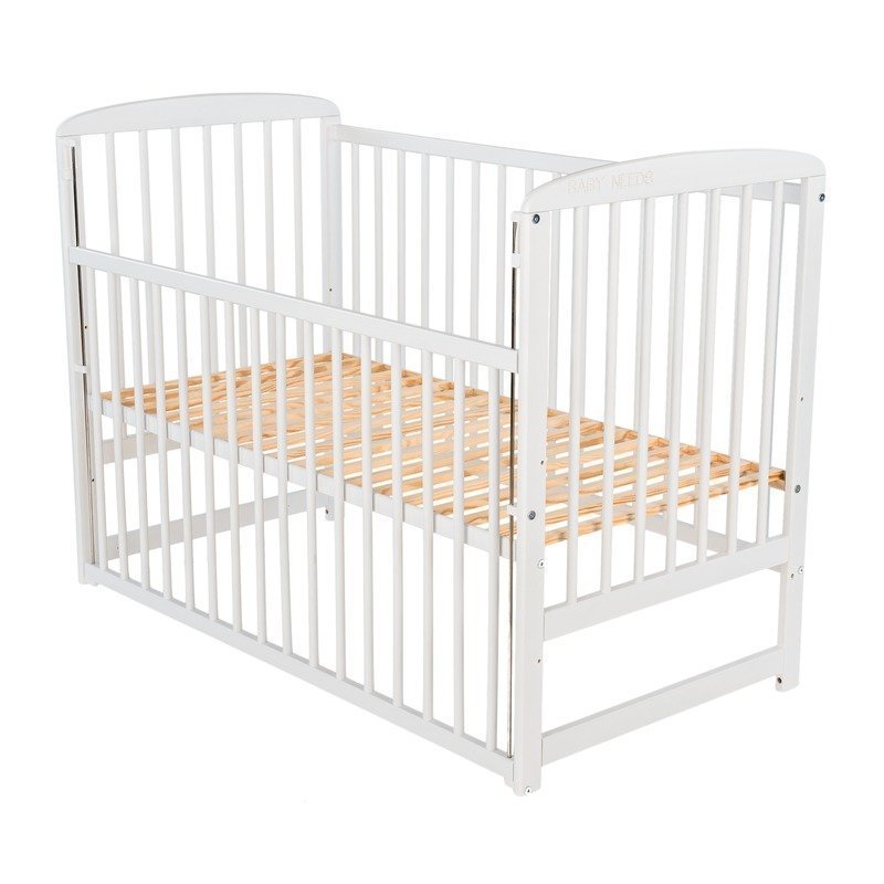 Patut din lemn bebe, 120x60 cm, Cu laterala culisanta, Din lemn de pin, Stabil si rezistent, Inaltime saltea reglabila pe 3 nivele, Laterala cu 3 bete detasabile, EN716-1, EN716-2, Alb, Babyneeds, Ola + Saltea 12 cm