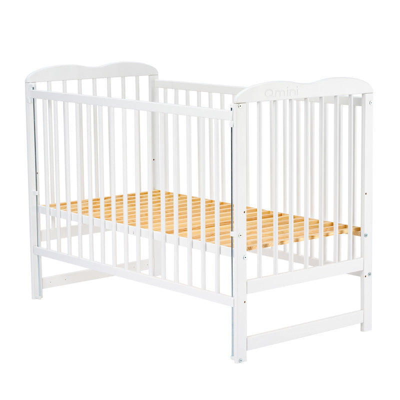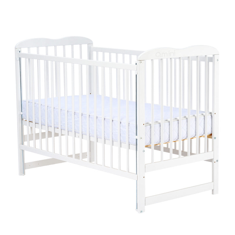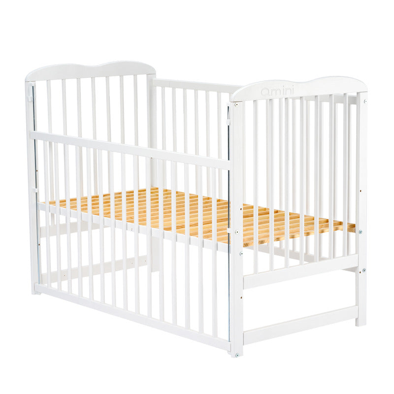 Patut din lemn bebe, 120x60 cm, Cu laterala culisanta, Din lemn de pin, Stabil si rezistent, Inaltime saltea reglabila pe 3 nivele, Laterala cu 3 bete detasabile, EN716-1, EN716-2, Alb, Qmini, Agata + Saltea 10 cm
