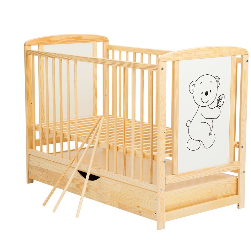 Patut din lemn bebe, 120x60 cm, Cu sertar cu capac, Din lemn de pin si mdf, Stabil si rezistent, Inaltime saltea reglabila pe 3 nivele, Laterala cu 3 bete detasabile, EN716-1, EN716-2, Natur, Babyneeds, Timmi + Saltea 10 cm