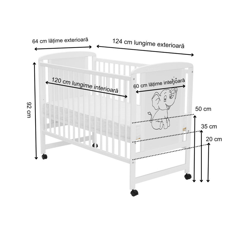 Patut din lemn bebe, 120x60 cm, Din lemn de pin si mdf, Stabil si rezistent, Inaltime saltea reglabila pe 3 nivele, Laterala cu 3 bete detasabile, EN716-1, EN716-2, Alb, Qmini, Timmi Elephant + Saltea 10 cm