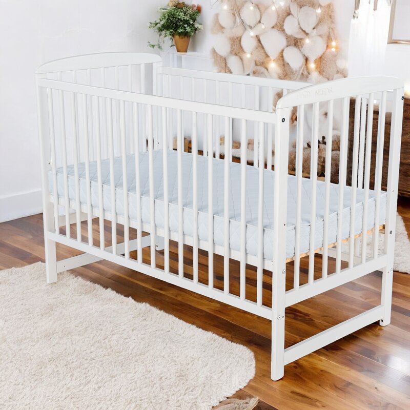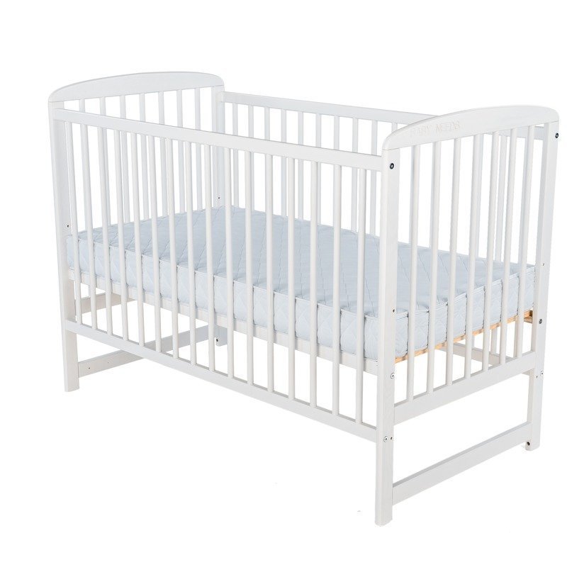 Patut din lemn bebe, 120X60 cm, Din lemn de pin, Stabil si rezistent, Inaltime saltea reglabila pe 3 nivele, Laterala cu 3 bete detasabile, EN716-1, EN716-2, Alb, Babyneeds, Ola + Saltea 12 cm