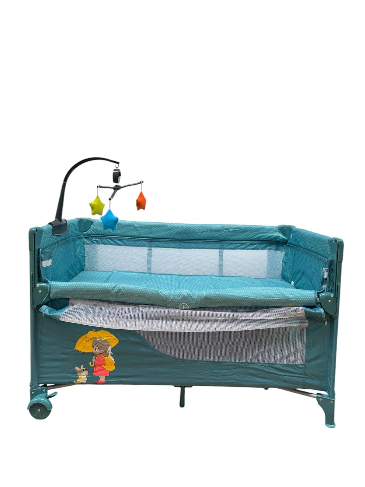 Patut pentru bebelusi cu baldachin,BBDP01 , laterala pliabila cu masa de infasat si carusel ,ALBASTRU