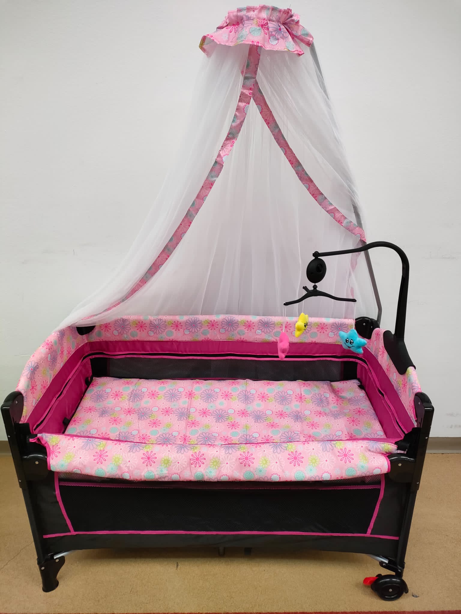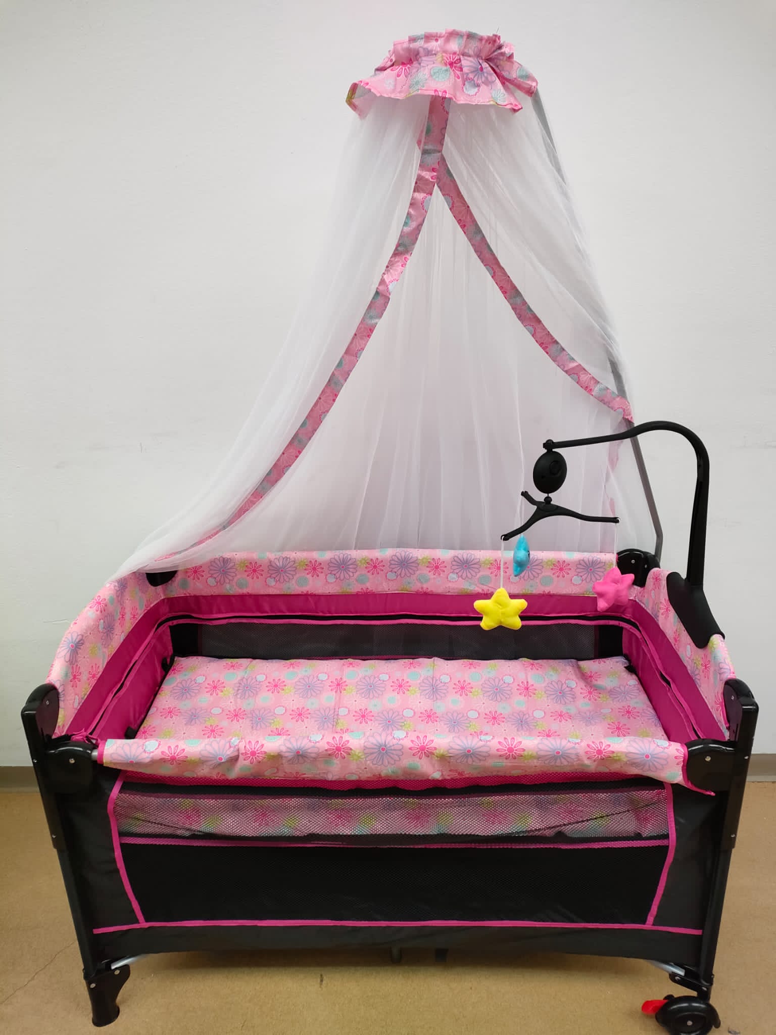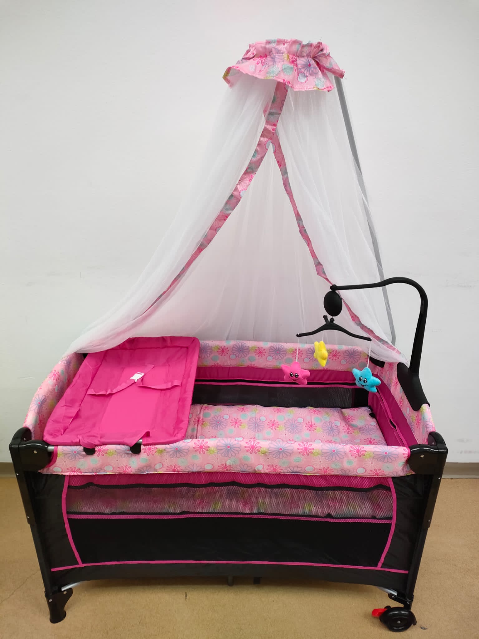 Patut pentru bebelusi cu baldachin , laterala pliabila cu masa de infasat si carusel , roz BBDT1ROZ