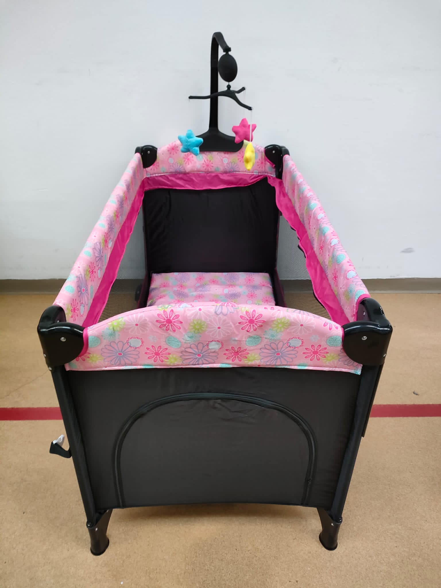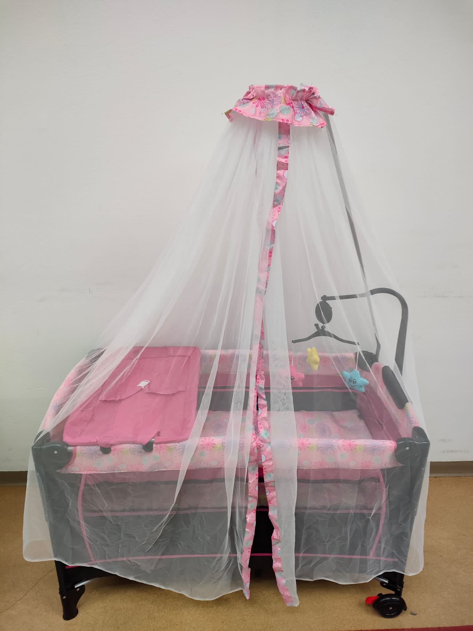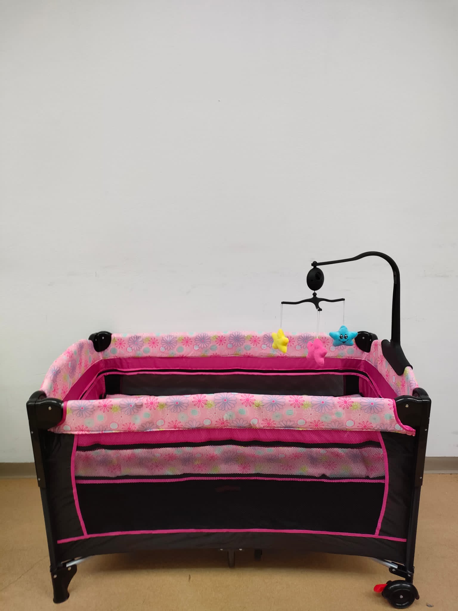 Patut pentru bebelusi cu baldachin , laterala pliabila cu masa de infasat si carusel , roz BBDT1ROZ