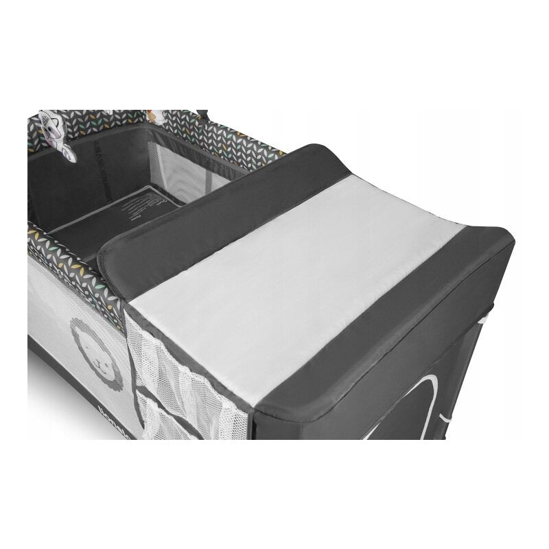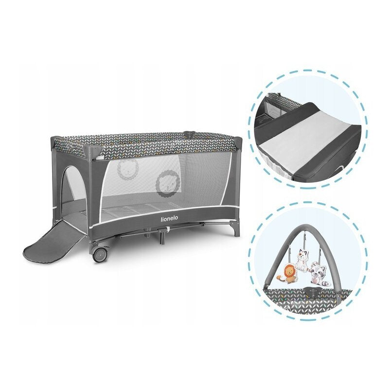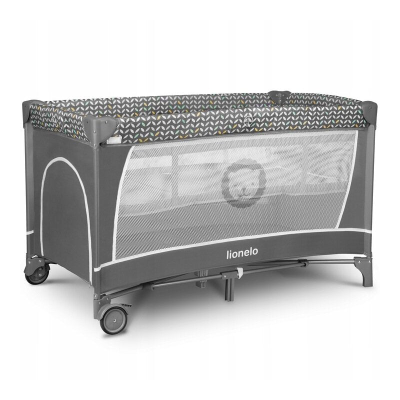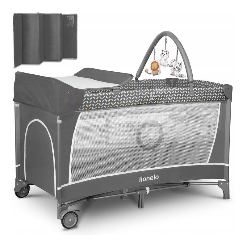 Patut pliant, Lionelo, Flower, Cu doua nivele, Cu arcada, Geanta transport, Masuta de infasat, Bara cu jucarii, Fereastra laterala, 120x60 cm, Conform cu standardele europeane de securitate EN 716 si EN12221, Gri
