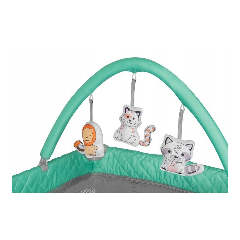 Patut pliant, Lionelo, Flower, Cu doua nivele, Cu arcada, Geanta transport, Masuta de infasat, Bara cu jucarii, Fereastra laterala, 120x60 cm, Conform cu standardele europeane de securitate EN 716 si EN12221, Turcoaz