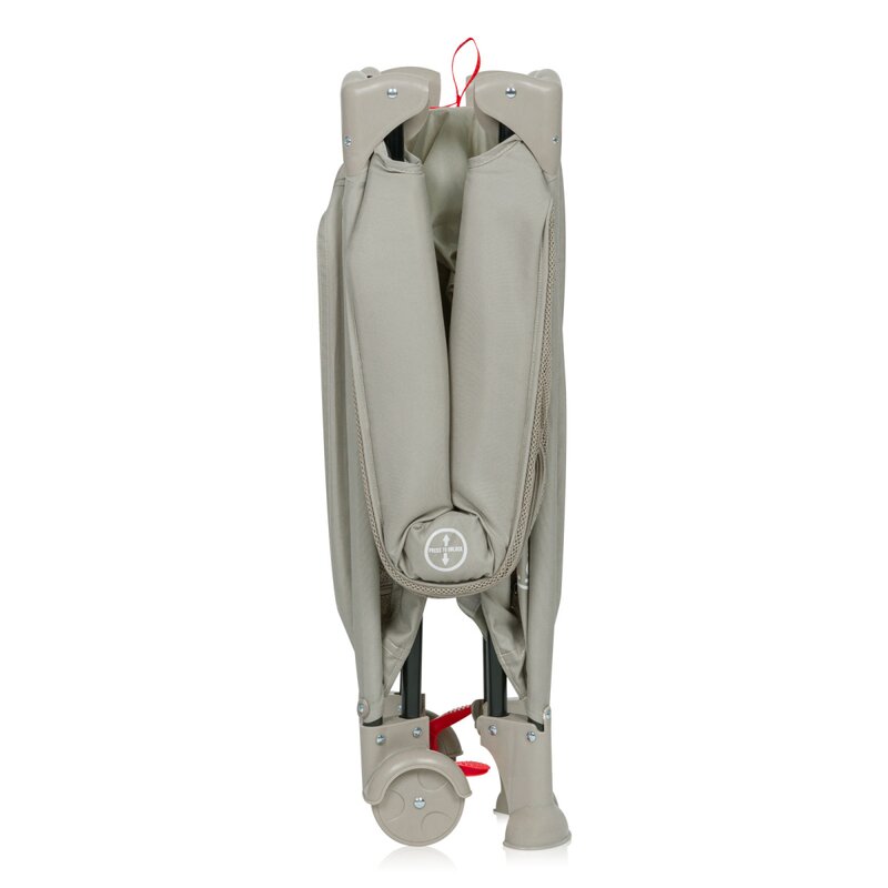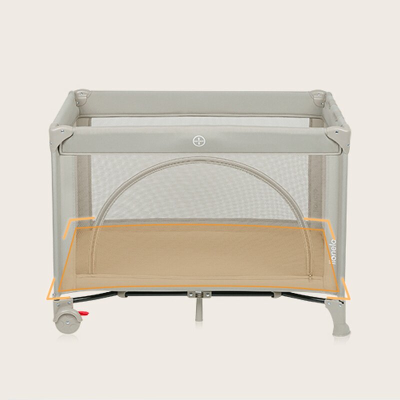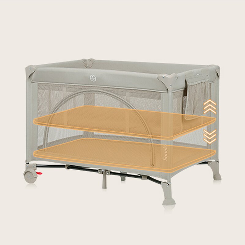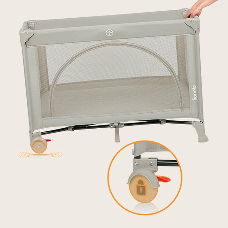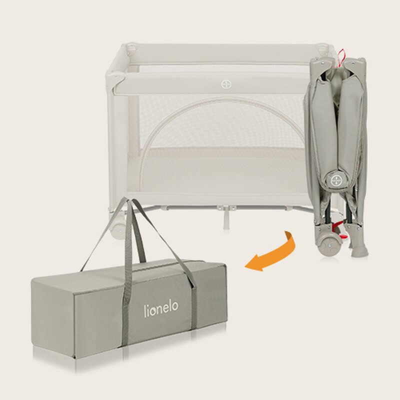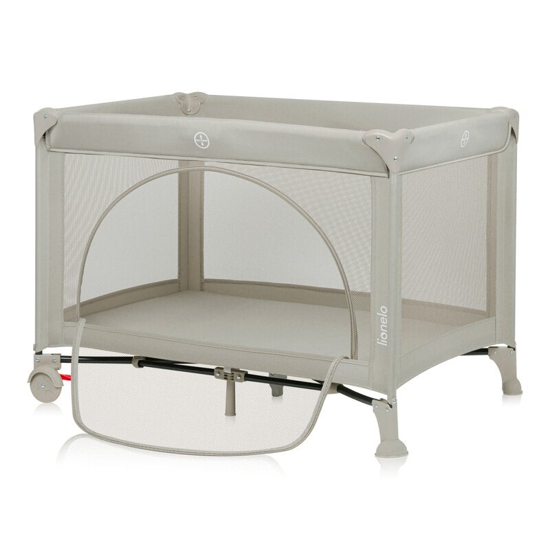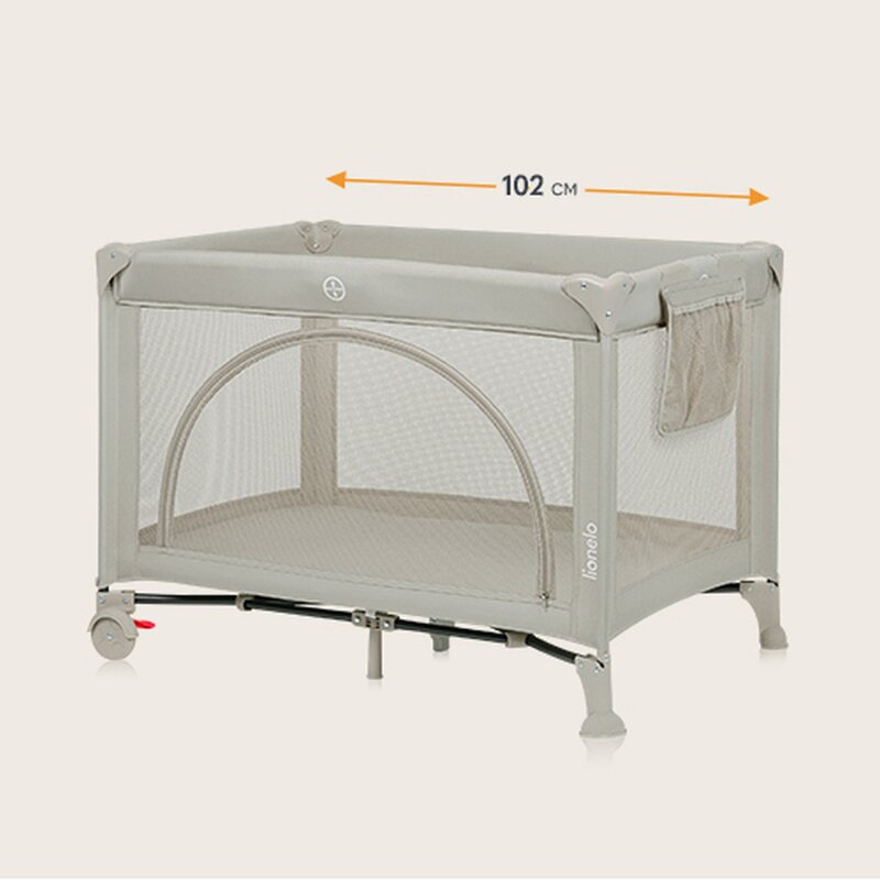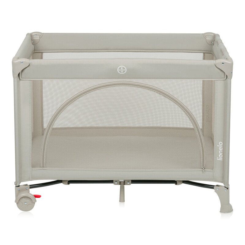 Patut pliant, Lionelo, Laura, 102 x 74 cm, Cu doua nivele, Functie de tarc, Cu roti, Include salteluta si geanta de transport, Pereti din plasa, Deschidere laterala, Pana la 15 kg, 0 luni +, Bej