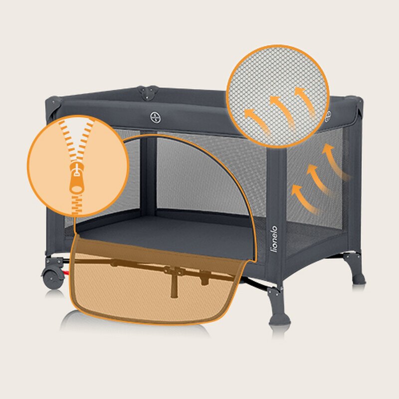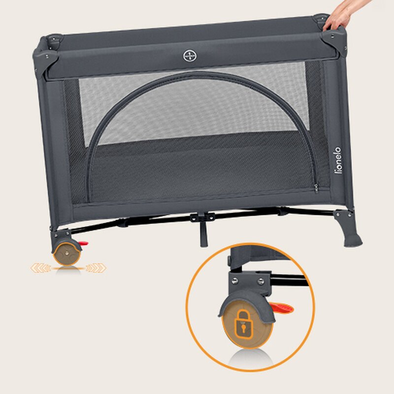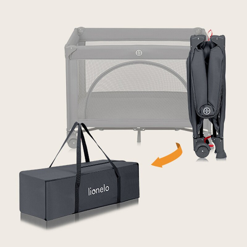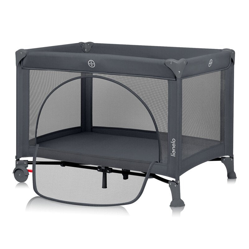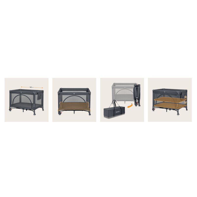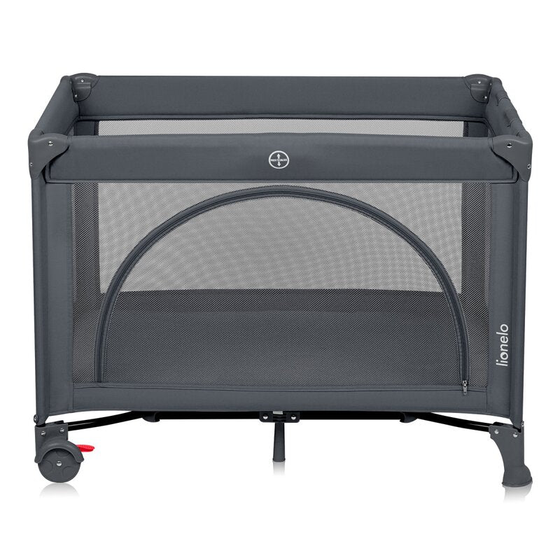 Patut pliant, Lionelo, Laura, 102 x 74 cm, Cu doua nivele, Functie de tarc, Cu roti, Include salteluta si geanta de transport, Pereti din plasa, Deschidere laterala, Pana la 15 kg, 0 luni +, Gri