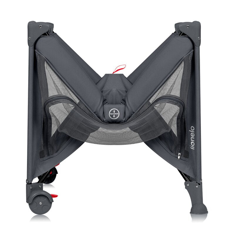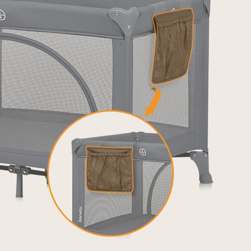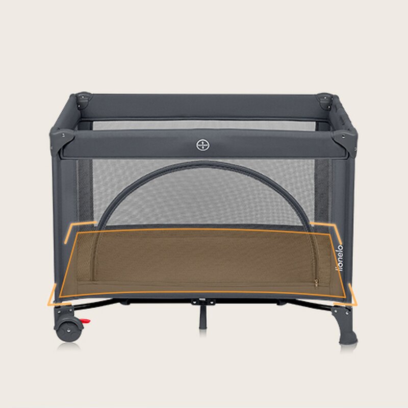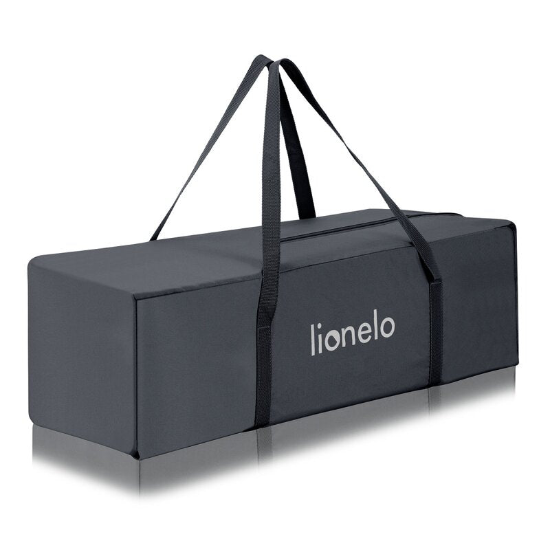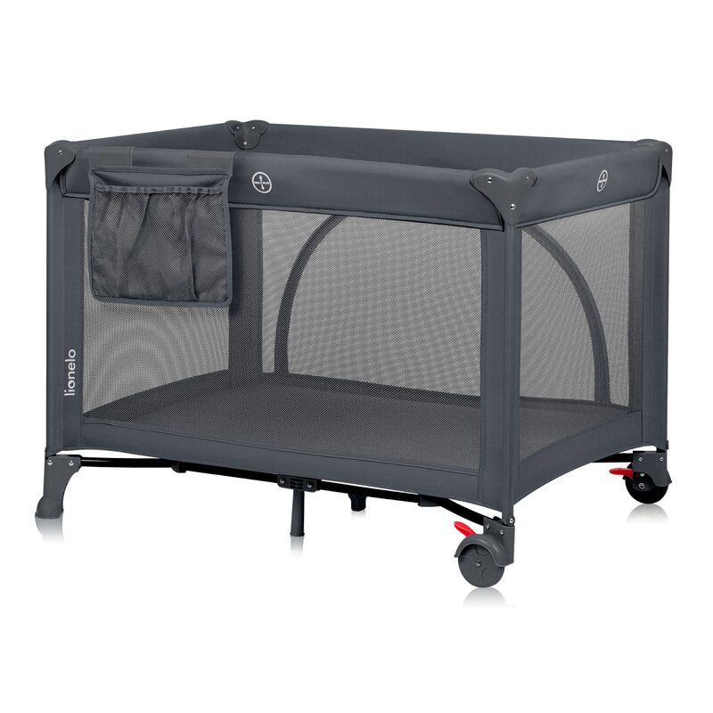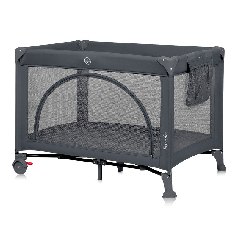 Patut pliant, Lionelo, Laura, 102 x 74 cm, Cu doua nivele, Functie de tarc, Cu roti, Include salteluta si geanta de transport, Pereti din plasa, Deschidere laterala, Pana la 15 kg, 0 luni +, Gri