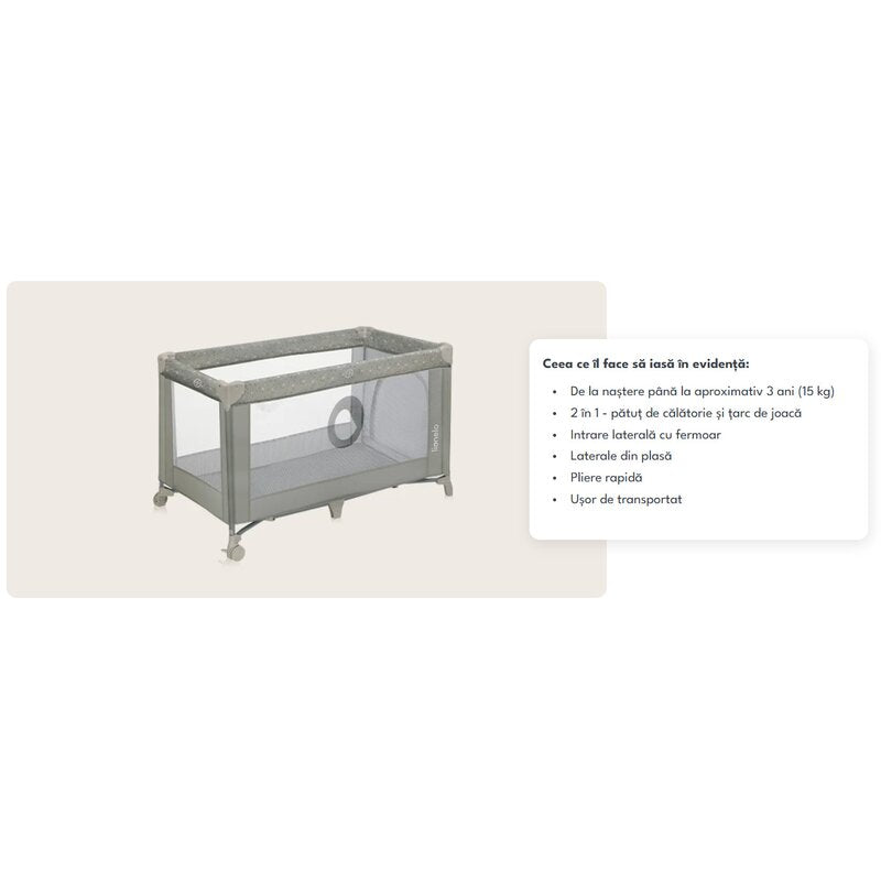Intrarea laterala permite copilului sa intre si sa iasa cu usurinta. Cele doua roti faciliteaza mutarea patutului prin casa, iar lateralele din plasa asigura ventilatie optima si contact vizual intre parinte si copil. Stefi este un patut, dar si un tarc practic, care combina perfect utilitatea zilnica cu confortul necesar in calatoriile in familie.
