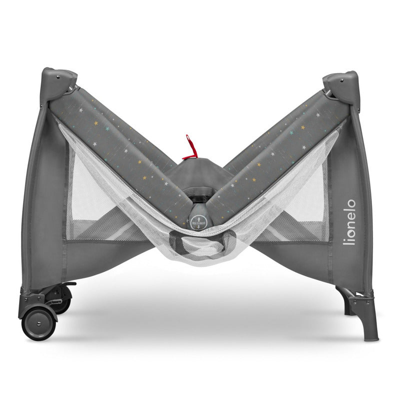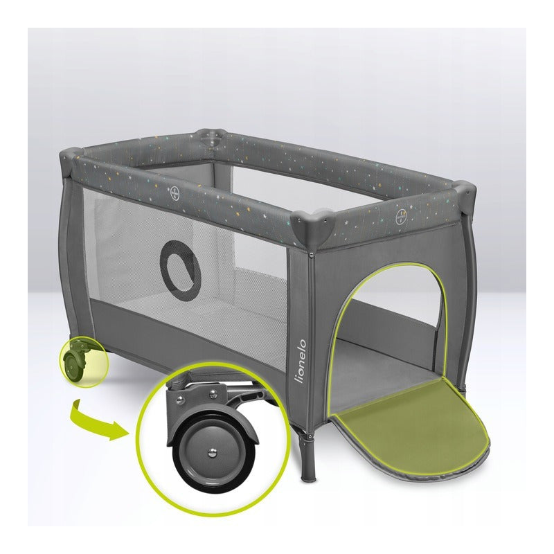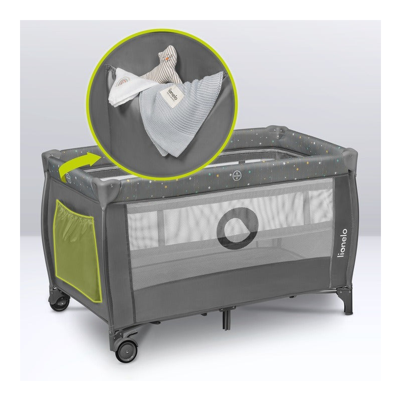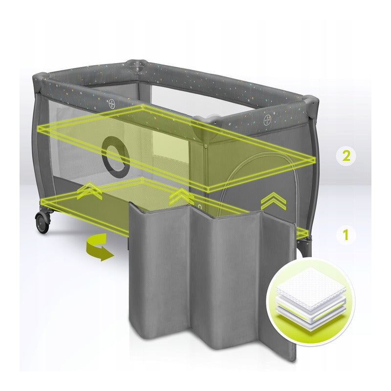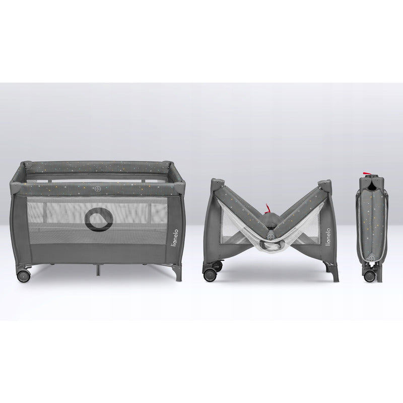 Patut pliant, Lionelo, Stefi Plus, Cu doua nivele, Cu intrare laterala cu fermoar, 2 roti, 120 x 60 cm, Conform cu standardul european de securitate EN 716, Gri/ Multicolor
