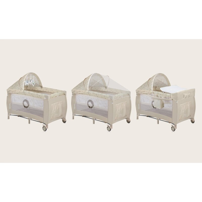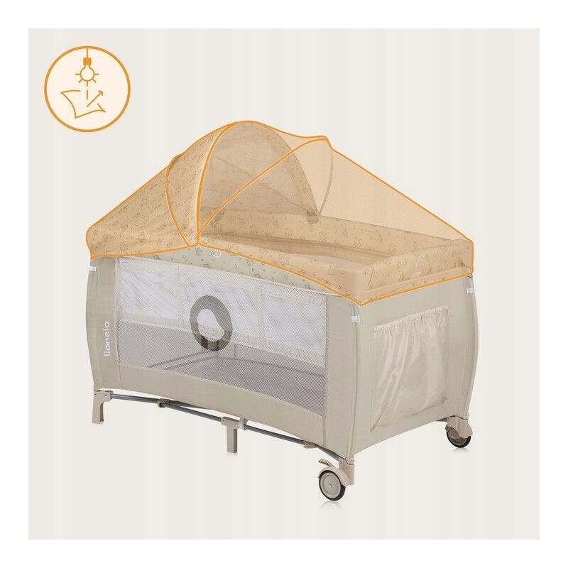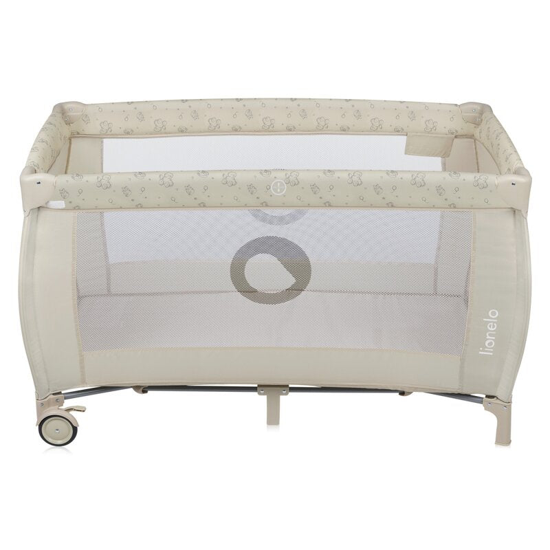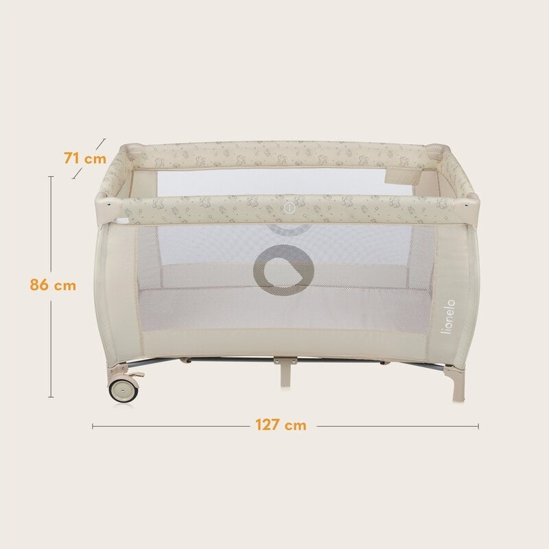 Patut pliant, Lionelo, Sven Plus, 120x60 cm, Cu doua nivele, Cu arcada jucarii, masuta de infasat, vibratii, melodii, conform cu standardele europeane de securitate EN716 si EN12221, Bej Latte