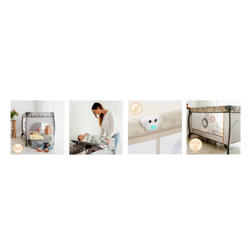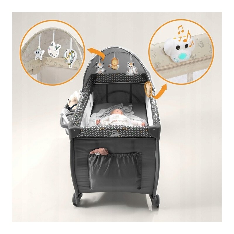 Copertina functionala (cu 3 jucarii captivante) va protejeaza bebelusul de lumina soarelui si de stimuli inutili, iar plasa de tantari inclusa va protejeaza impotriva insectelor. Asadar, patutul de copii poate fi folosit si in aer liber atunci cand temperatura o permite.