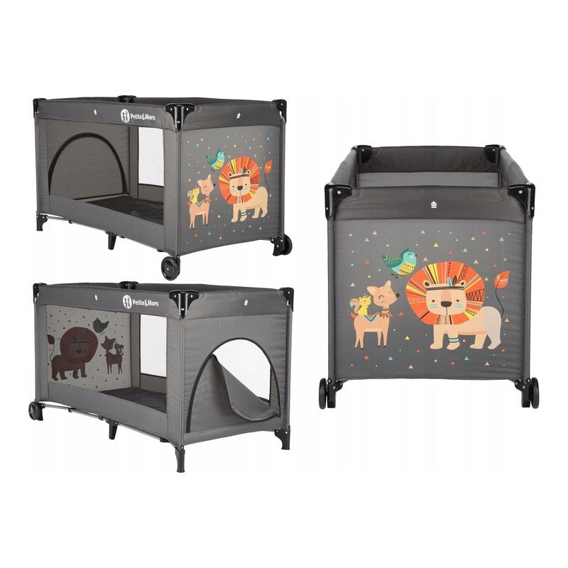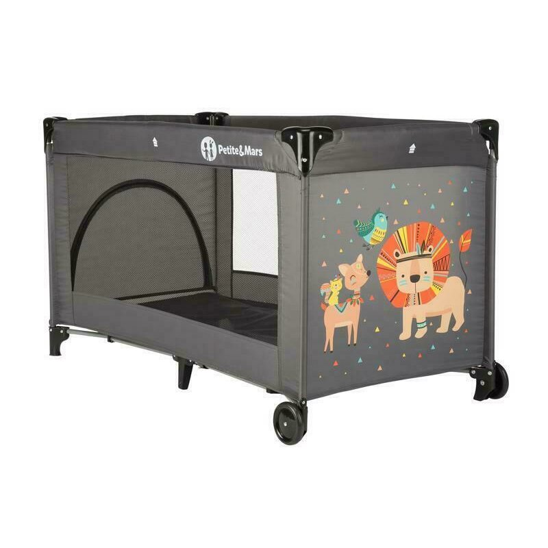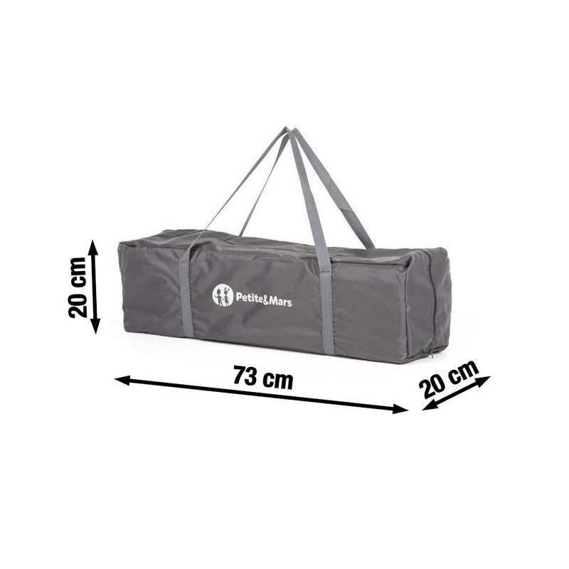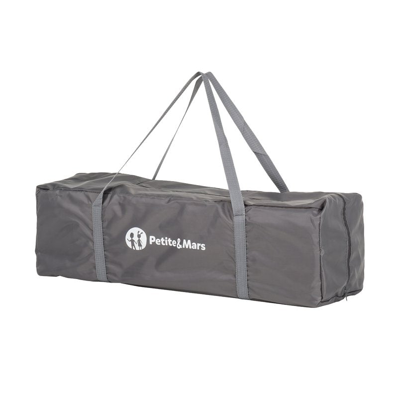 Patut pliant, Petite&Mars, Cu un nivel, Cu intrare laterala cu fermoar, 2 roti, 120x60 cm, Conform cu standardele europene de securitate EN 716-1:207+AC:2019, EN 716-2:2017, EN 71-3:2019, Leut Gri
