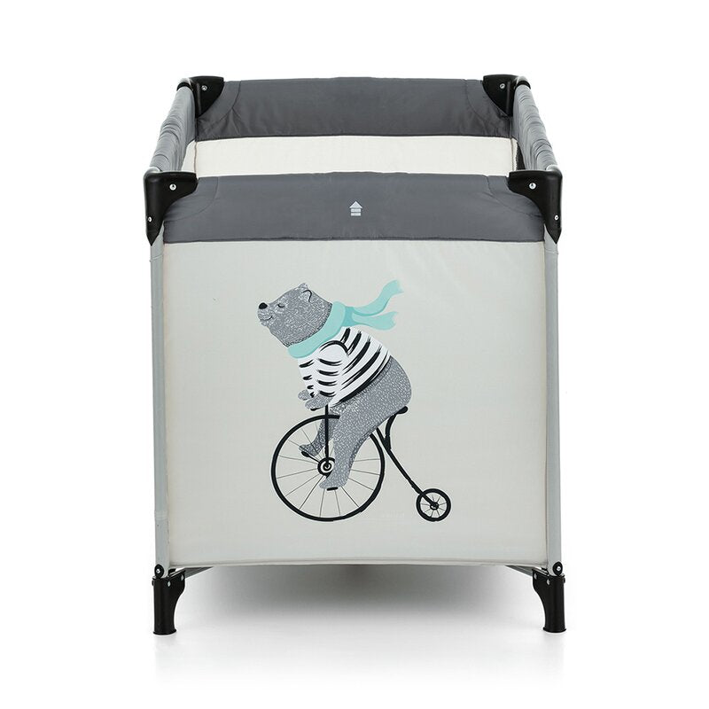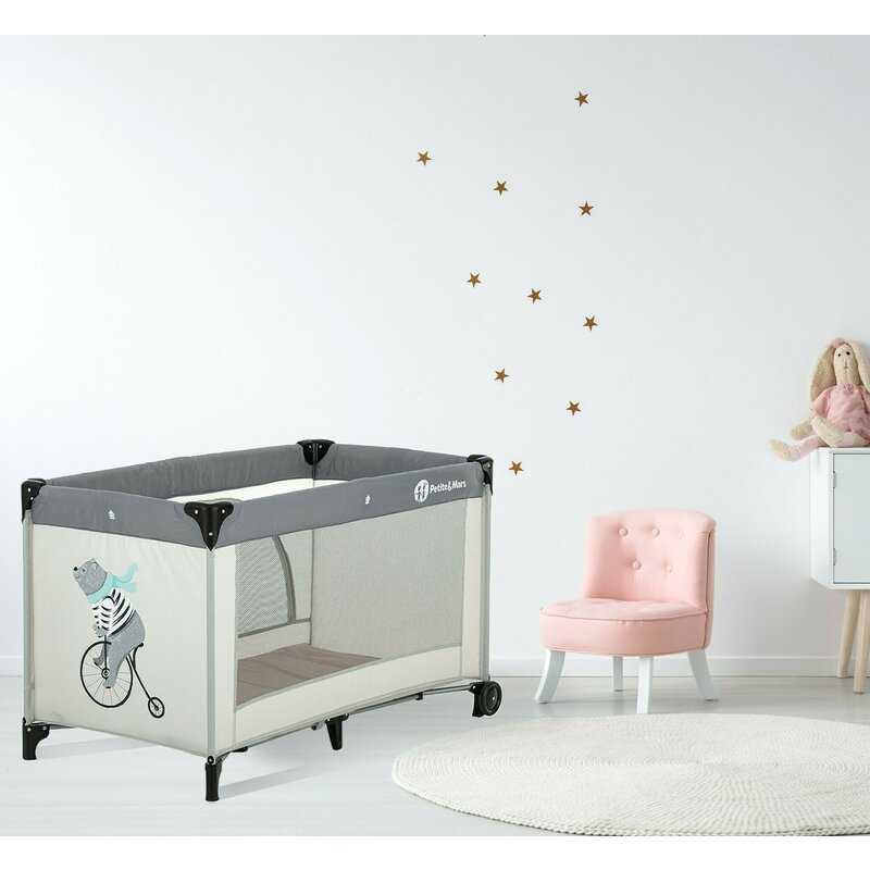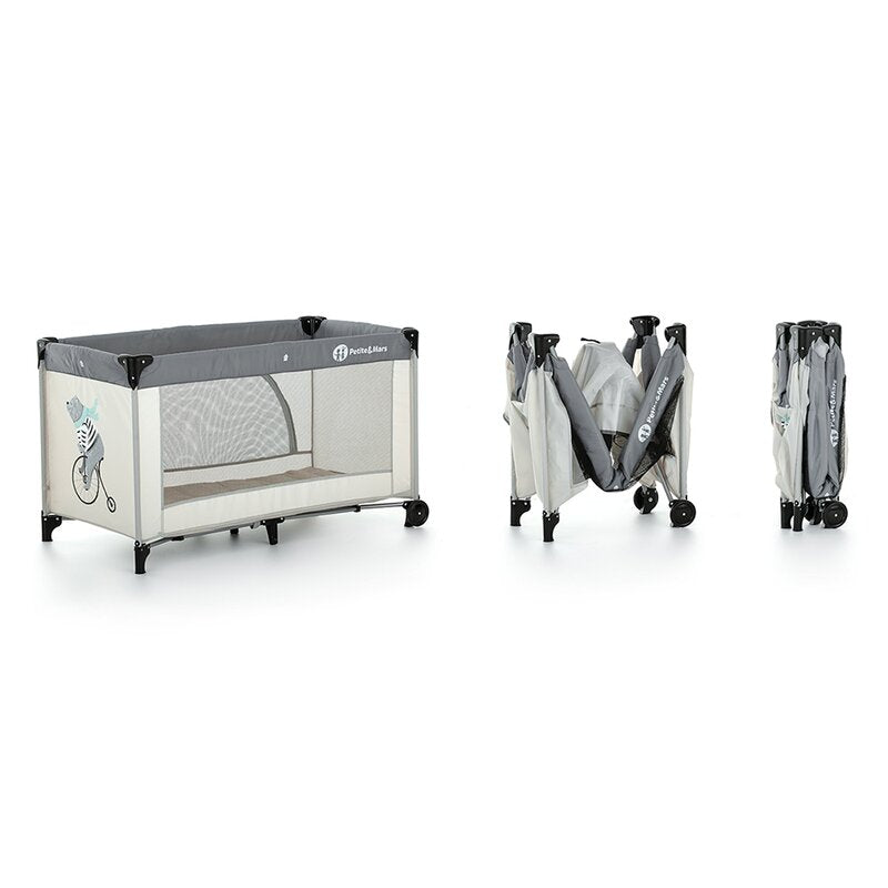 Patut pliant, Petite&Mars, Nyja Teddy Biker, Cu un nivel, Cu intrare laterala cu fermoar, 2 roti, 120x60 cm, Conform cu standardele europene de securitate EN 716-1:207+AC:2019, EN 716-2:2017, EN 71-3:2019, Grey