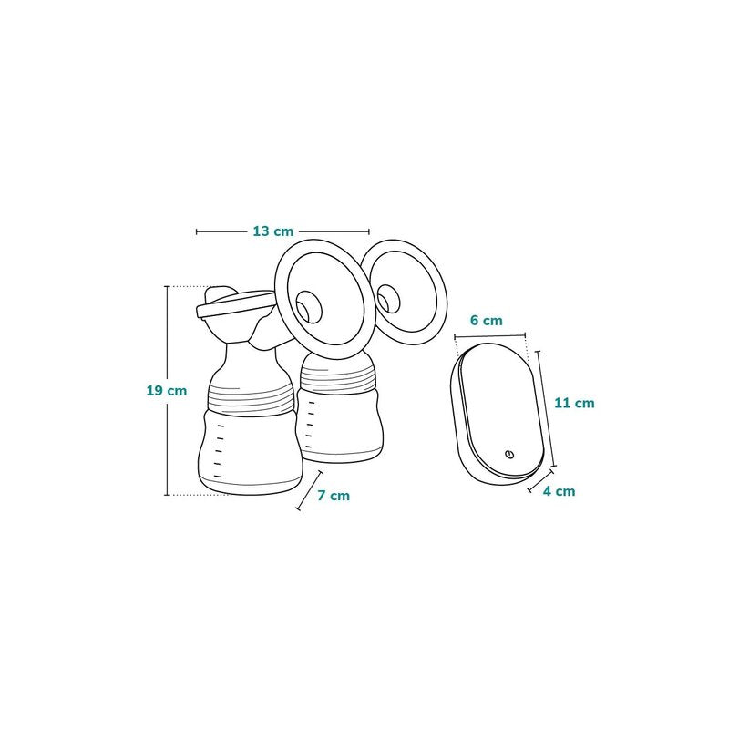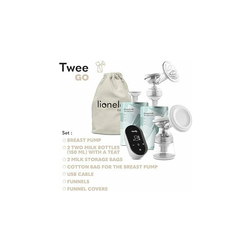 Pompa de san Lionelo Twee Go este gata de utilizare imediat cum o scoateti din cutie. Setul include toate accesoriile necesare: doua recipiente pentru lapte (150 ml), doua cupe cu absorbante, doua scuturi pentru sani cu capace, doua pungi pentru depozitarea laptelui, un cablu USB si un saculet din bumbac.