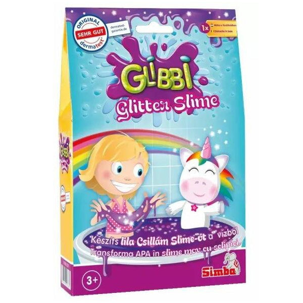 - Glibbi Glitter Slime contine un pachet de pulbere, care transforma apa in gelatina