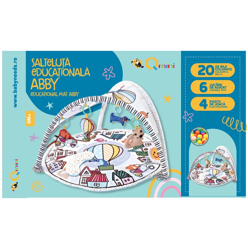 Qmini - Salteluta interactiva Abby , Cu muzica, 20 bile, 6 jucarii , Pentru activitati educationale, din Poliester, 85x85 cm, Multicolor, Resigilat