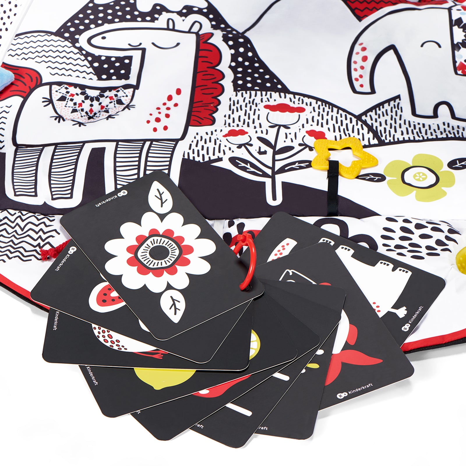 Covoras interactiv Kinderkraft 4SMART MULTICOLOR Covorasul interactiv cu contrast cromatic Kinderkraft 4SMART, cu 4 zone de interactiune ce sprijina dezvoltarea copilului, este destinat copiilor din primele luni de viata. În primele luni de viata, copiii percep doar culorile contrastante. Pentru a stimula imaginatia celui mic si a-i sprijini dezvoltarea din primele luni, am creat covorasul Kinderkraft 4SMART in culori clare, contrastante. Kinderkraft 4SMART are 4 zone care dezvolta vazul, atingerea, auzul si concentrarea. Zona 1 dezvolta vazul este decorata in culori contrastante - negru, alb si rosu cu accente galbene. Are panglici colorate, care atrag atentia copilului si il ajuta sa deosebeasca culorile. Zona 2 dezvolta auzul are elemente care fosnesc si zornaie, ce il obisnuiesc pe cel mic cu diverse sunete. Copilul este liber sa le stranga in mana si sa le atinga. Zona 3 dezvolta atingerea aici se afla elemente tridimensionale cu diverse texturi, datorita carora copilul isi stimuleaza simtul tactic si descopera noi forme si texturi. Zona 4 ii ajuta pe cei mici sa isi dezvolte puterea de concentrare covorasul are locuri speciale pentru introducerea cartonaselor contrastant colorate si oglinzii. Aceste elemente capteaza atentia copilului si il invata sa se concentreze asupra unei anumit activitati. Setul include 2 stalpi cu o agatatoare ce gliseaza, de care se pot atarna si muta dupa dorinta jucariile incluse 12 cartonase educative Kinderkraft 4SMART, o oglinda suspendata, minge de atarnat care zornaie, jucarie de atarnat care fasaie, minge senzoriala, jucarie de plus, panglici colorate, bile zornaitoare si oglinda, care se pot introduce in spatele foliei. Cartonasele se afla pe un inel se pot atasa de carucior sau de ghiozdan, de exemplu. În plus, setul contine si o minge senzoriala. Este mare, are diferite culori, butoane si desene, datorita carora va atrage privirea copilului si ii va oferi multa bucurie. Imprimeul interesant, stilistica si multifunctionalitatea fac din el covorasul ideal pentru fiecare copil. Avantaje Functionalitate Covorasul a fost proiectat cu gandul la cei mai mici copii, care inca nu recunosc culorile si contrastele majore. De aceea, principalele culori ale covorasului sunt cele puternice negru, alb si rosu cu accente galbene. Are 4 zone de dezvoltare vaz zona cu culori contrastante. Covorasul are panglici colorate si culori, care atrag privirea si atentia copilului, auz elemente care fosnesc si zornaie, care atrag atentia copilului si obisnuiesc copilul cu diferite sunete, atingere zona cu elemente tridimensionale (snururi si mingi) cu diverse texturi, astfel incat copilul sa le poate atinge si sa-si stimuleze simtul tactil, concentrare covorasul are un loc special pentru a introduce cartonasele contrastante si oglinda. Setul include multe jucarii care stimuleaza simturile 12 cartonase contrastante, oglinda suspendata, mingea de atarnat care zornaie, jucarie de atarnat care fasaie, minge senzoriala, jucarie de plus, panglici colorate, bile zornaitoare si oglinda, care se pot introduce in spatele foliei. Cartonasele se pot lua la plimbare cartonasele Kinderkraft 4SMART au un carlig special cu care pot fi agatate, de exemplu, de carucior. Setul include si o minge senzoriala mare, care stimuleaza imaginatia copilului si ii aduce acestuia multa bucurie. Imprimeul interesant si stilistica il fac un covoras ideal pentru fiecare copil. Covorasul educativ Kinderkraft 4SMART este ideal pentru un cadou este multifunctional, si in plus are si un ambalaj deosebit. În plus, este un cadou practic dezvolta simturile copilului, ii stimuleaza imaginatia si ii va servi pentru mult timp. Confort Covorasul are stalpi reglabilidotate cu o agatatoare care gliseaza usor, iar jucariile care atarna sunt usor de miscat si asezat oriunde. Covorasul este usor si simplu de impaturit (dupa desprinderea stalpilor). Îl poti lua cu tine in vacanta fara nicio problema! Murdaria nu va fi o problema covorasul este foarte usor de curatat. Baza covorasului se poata spala manual, iar restul jucariilor sunt usor de curatat cu o carpa. Siguranta Covorasul interactiv Kinderkraft 4SMART izoleaza bine fata de podea. Covorasul este potrivit pentru copii inca din primele zile de viata indeplineste standardele EN 71-1, EN 71-2, EN 71-3 pentru jucarii si covorasele educative. Este realizat cu atentie cusaturile puternice si lipsa elementelor proeminente, usor de desprins sporesc siguranta copilului. Constructie Materiale Covorasul poliester Jucariile poliester, plastic Cartonasele hartie Dimensiuni 128 cm x 116 cm, Înaltimea de la sol pana la stalpi 46,5 cm Dimensiunile covorasului cu marginile desfacute 126 x 112 Dimensiunile covorasului cu marginile pliate 75x75 Dimensiunile cartonaselor 12x19 Greutate 1,1 kg Dimensiunile ambalajului/greutate 65 cm x 46 cm x 10 cm/1,6 kg