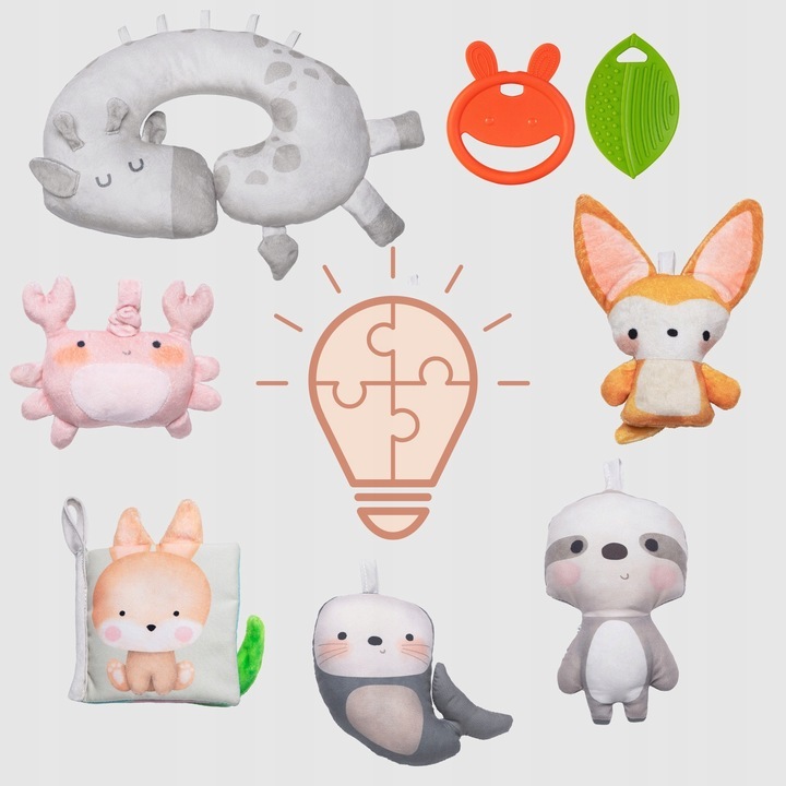- 8 jucării senzoriale atent selectate pentru dezvoltarea coordonării, explorării și simțurilor.