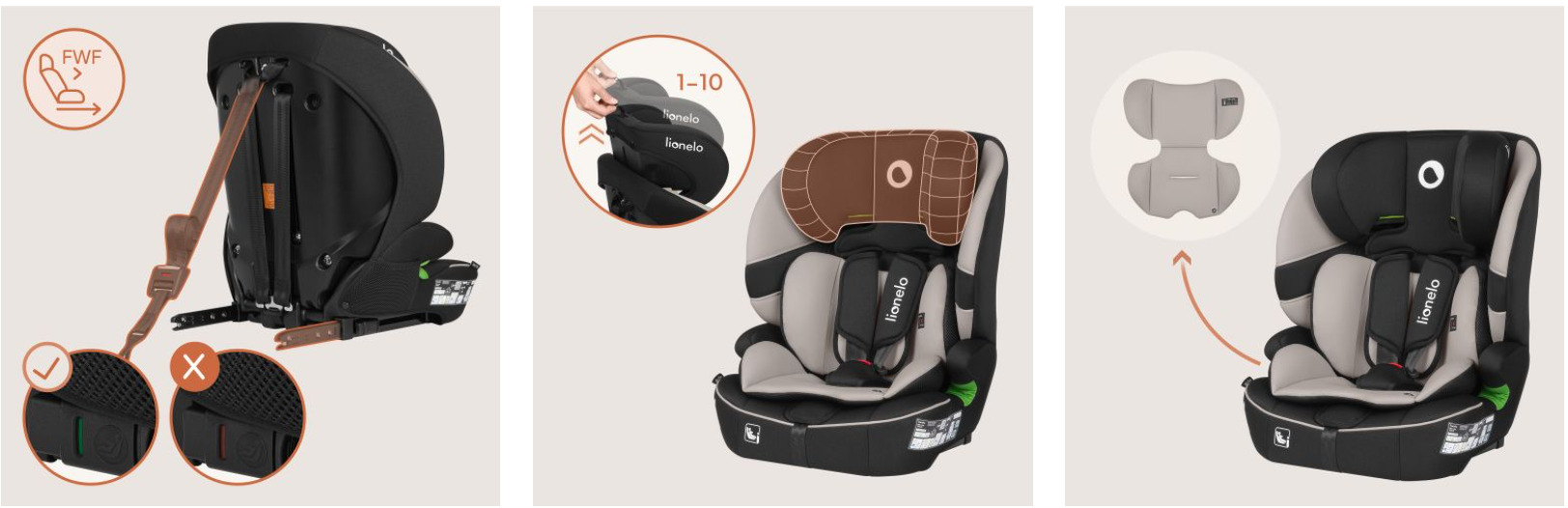 Scaun auto i-Size, Lionelo, Billy , 76 - 150 cm, 1/2/3, Isofix + top tether, Tetiera reglabila in 10 pozitii, Insertie ergonomica, Tapiterie lavabila, Testat la impact, Baza lata, Conform cu R129, Bej