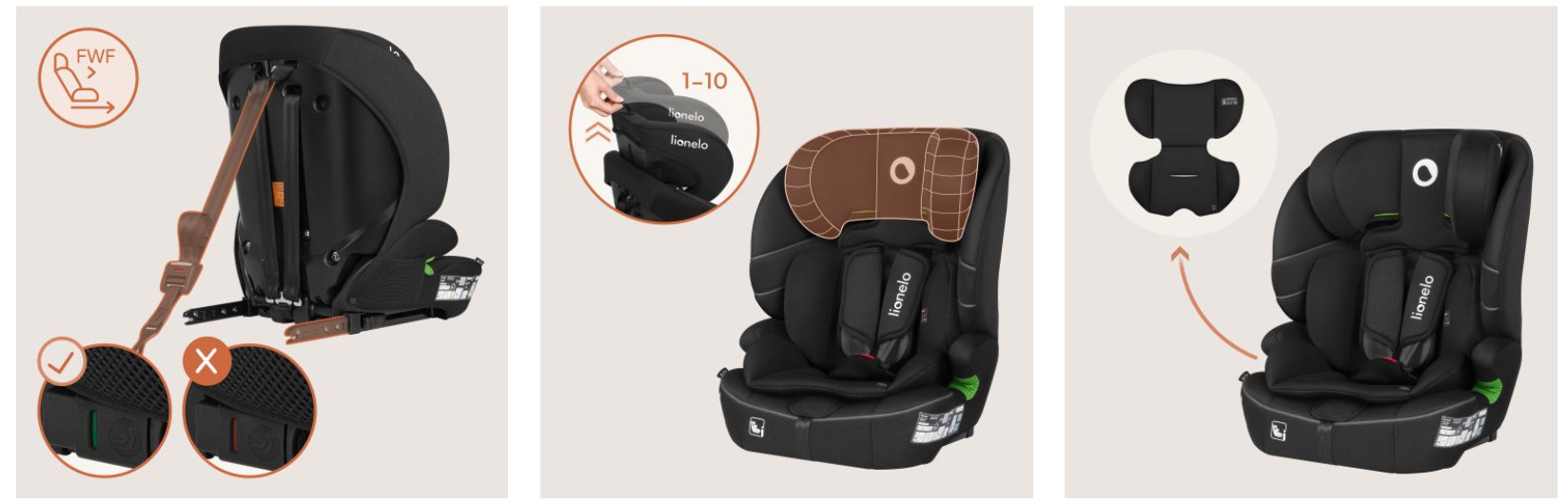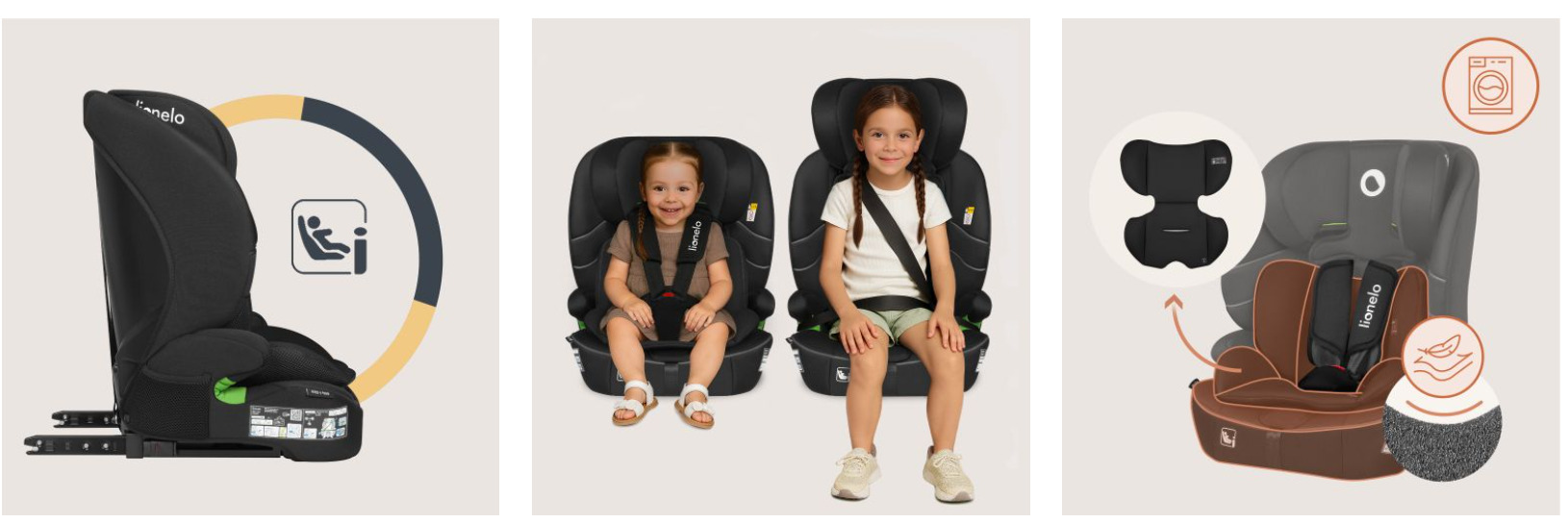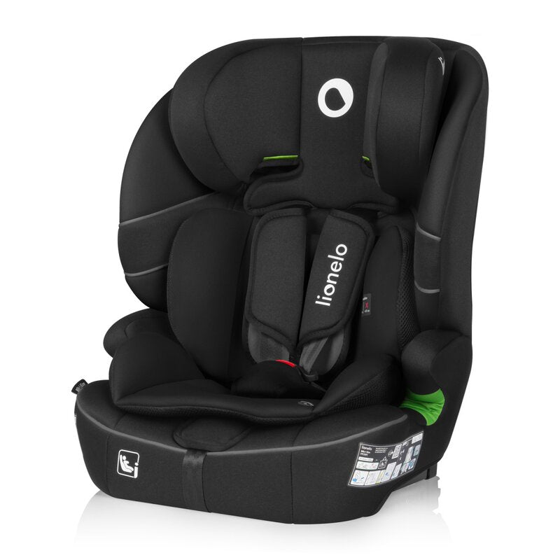 Scaun auto i-Size, Lionelo, Billy , 76 - 150 cm, 1/2/3, Isofix + top tether, Tetiera reglabila in 10 pozitii, Insertie ergonomica, Tapiterie lavabila, Testat la impact, Baza lata, Conform cu R129, Negru