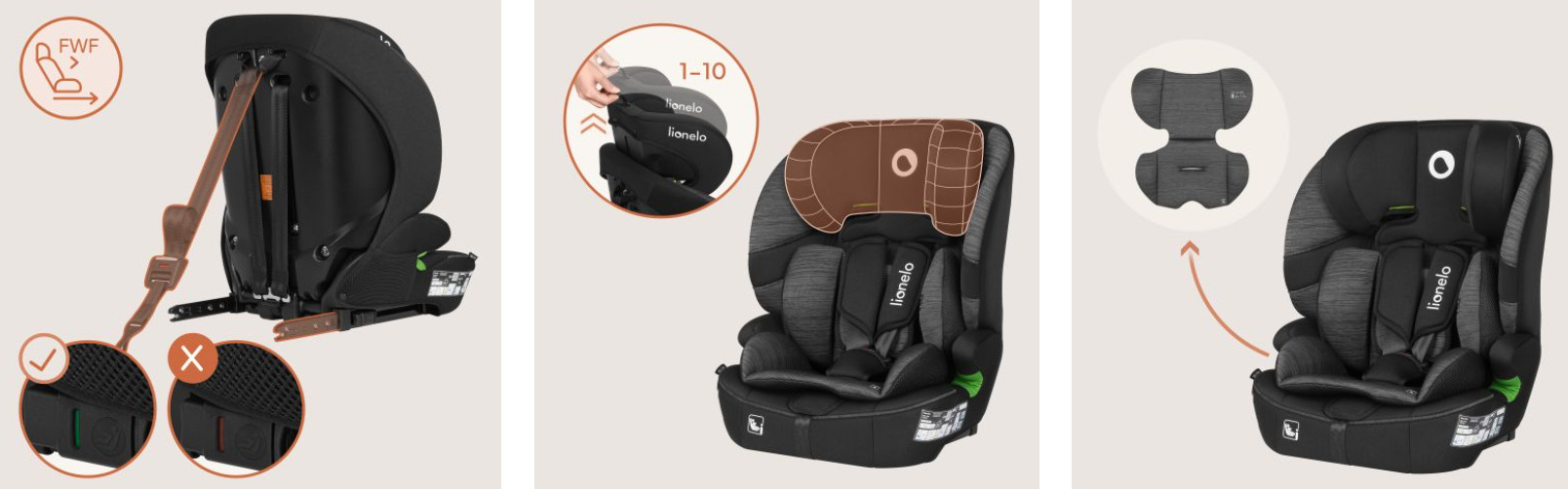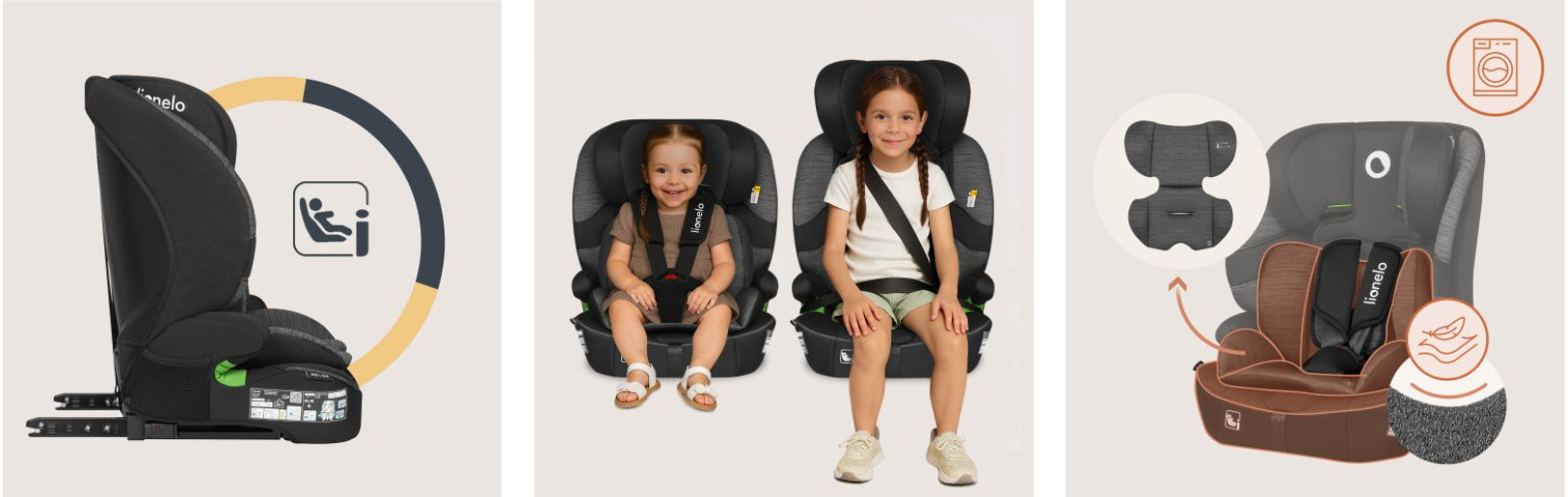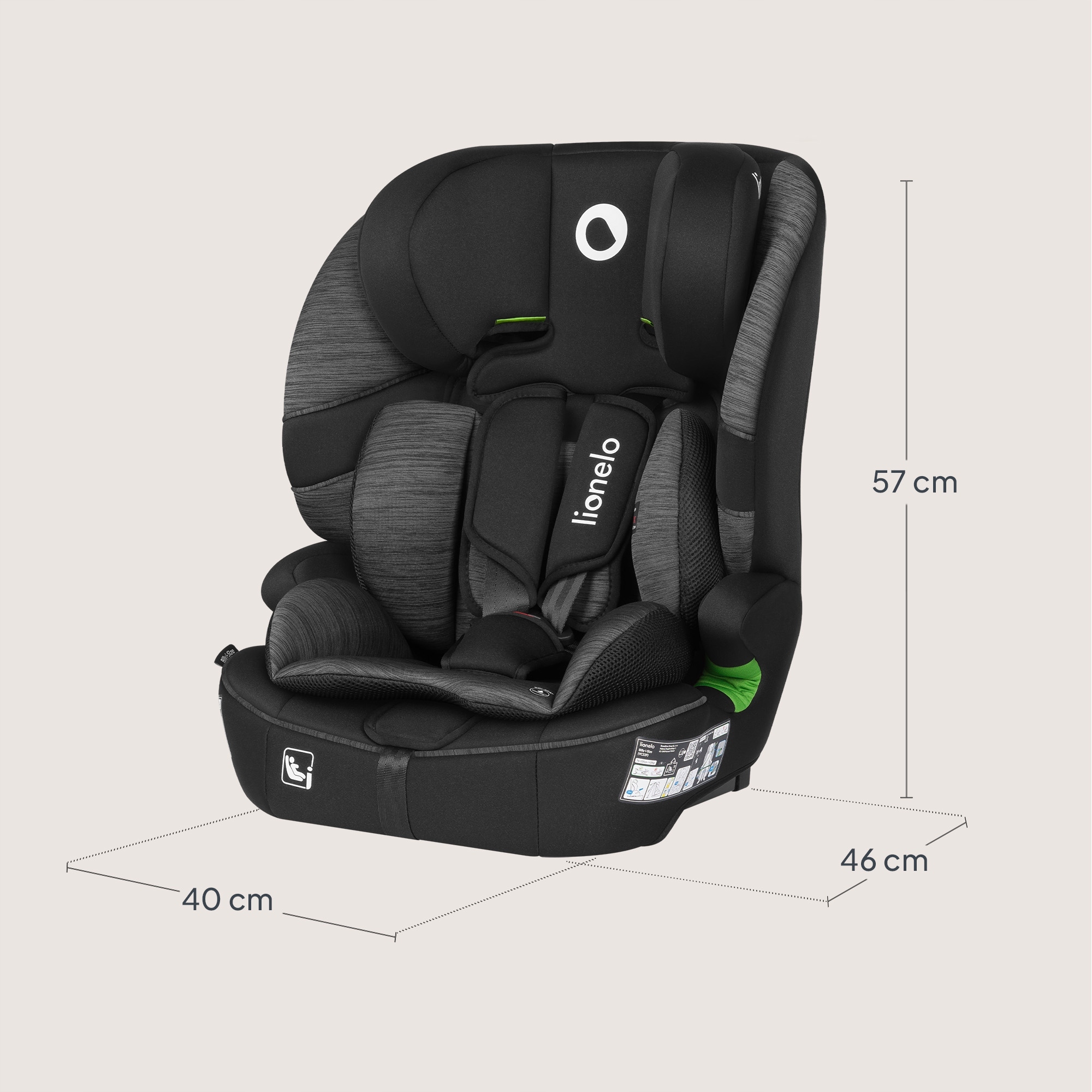 Scaun auto i-Size, Lionelo, Billy , 76 -150 cm, 1/2/3, Isofix + top tether, Tetiera reglabila in 10 pozitii, Insertie ergonomica, Tapiterie lavabila, Testat la impact, Baza lata, Conform cu R129, Negru/Gri
