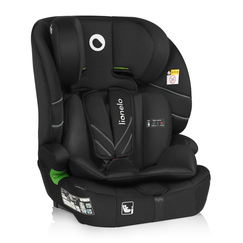 Scaun auto i-Size, Lionelo, Levi Fix, 76 - 150 cm, 1/2/3, ISOFIX + Top Tether, Tetiera reglabila in 10 pozitii, Insertie ergonomica Dri-Seat, Tapiterie lavabila, Testat la impact, Baza lata, Cotiere practice, Conform cu R129, Negru