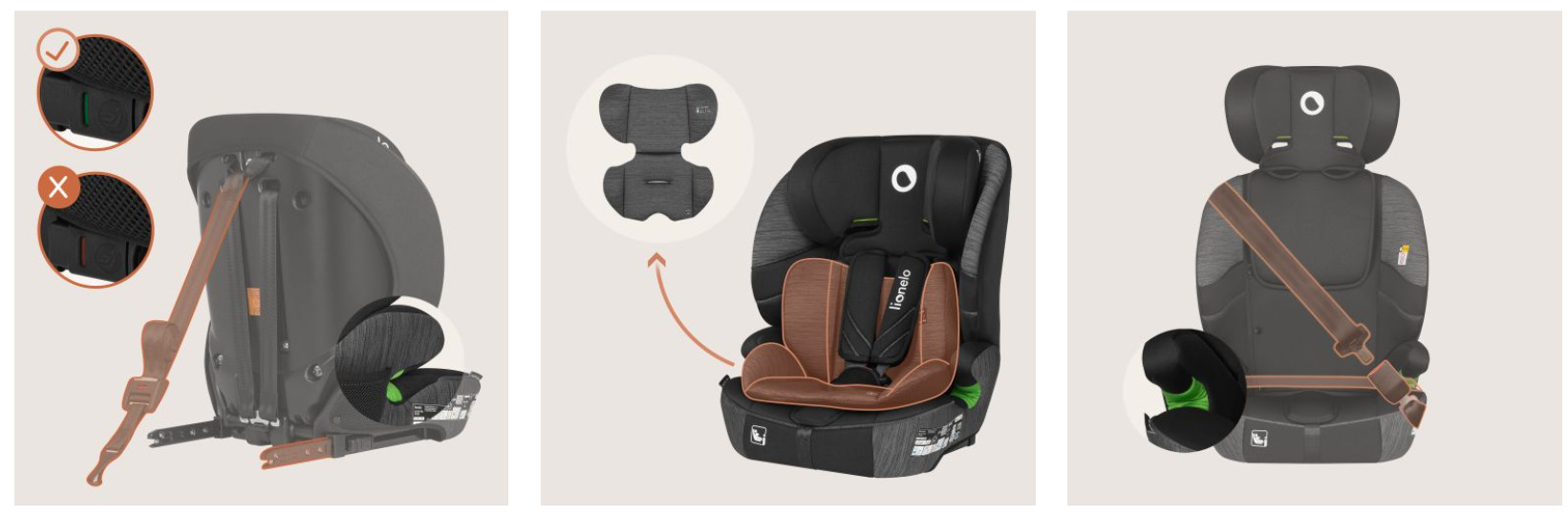 Levi Fix i-Size se instalează intuitiv, rapid și sigur. Pentru copiii mici (76–105 cm), se folosește Isofix + Top Tether și centura internă în 5 puncte. Pe măsură ce copilul crește (100–150 cm), scaunul poate fi utilizat fie cu Isofix + centura auto în 3 puncte, fie doar cu centura mașinii, ghidajele laterale asigurând poziționarea corectă a centurii.