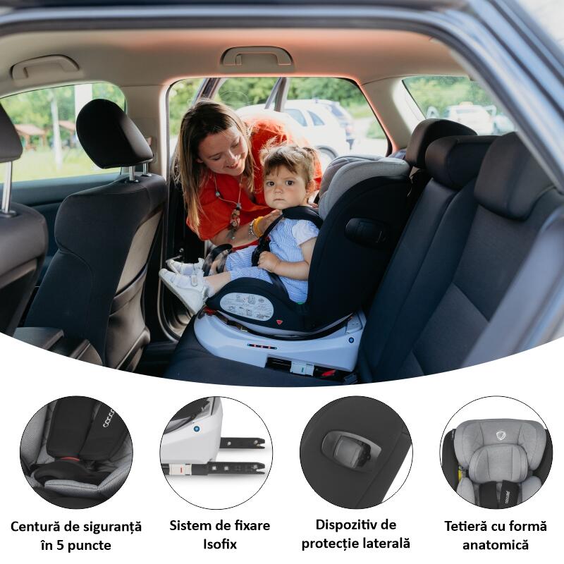 Functia de rotatie aduce un plus de confort si parintilor, carora le va fi foarte usor sa puna si sa scoata copilul din scaunul auto.