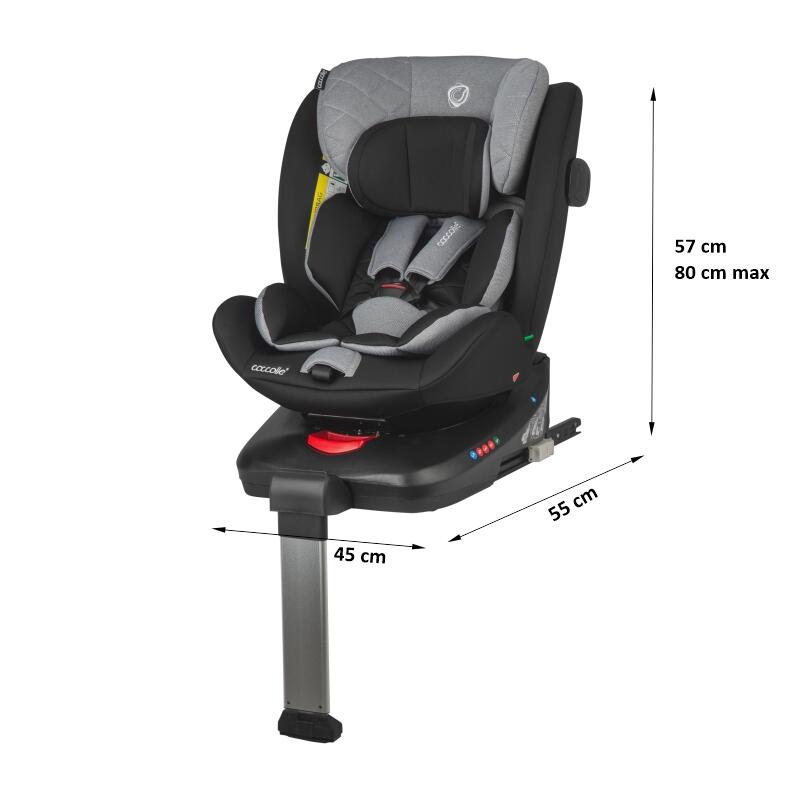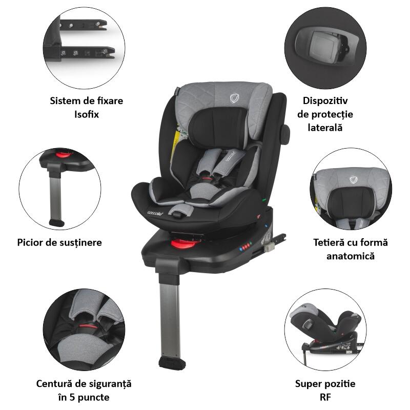 Gratie bazei rotative, aveti posibilitatea de a va transporta copilul atat cu fata cat si cu spatele la sensul de mers cu o usurinta iesita din comun. Sistemul isofix si piciorul de sustinere nu doar ca asigura protectie deosebita la bordul autoturismului, ci faciliteaza instalarea corecta si rapida a produsului in masina.