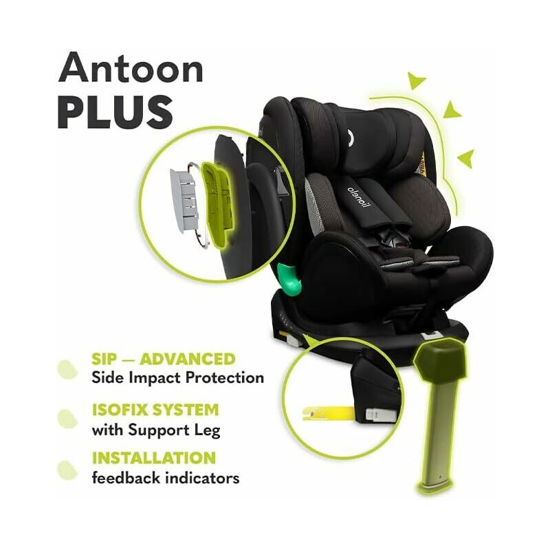 - Antoon Plus Black Onyx este echipat cu o reglare a inclinarii spatarului pe 5 trepte si o reglare a tetierei pe 10 nivele. Pentru a oferi pasagerilor mici un confort ridicat de calatorie, setul a fost furnizat cu un suport lombar si Dri-Seat.