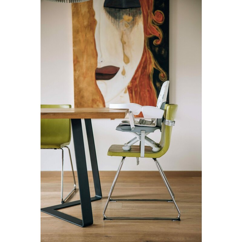 Poate fi folosit ca mini-scaun de sine statator sau atasat cu usurinta pe un scaun de masa existent (min. 39 cm latime, 34 cm adancime, 32 cm inaltime).