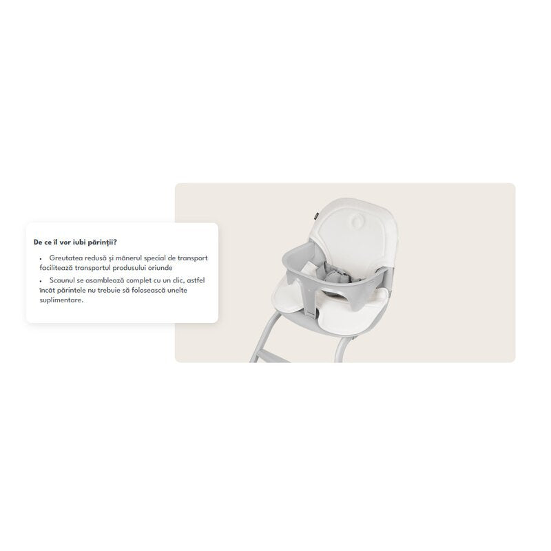 Lionelo Dalia este un scaun ergonomic de hranire 2 in 1, care poate fi utilizat de la 6 luni pana cand copilul atinge greutatea de 60 kg. Produsul este ideal pentru perioada de diversificare a alimentatiei bebelusului - datorita tavitei practice, ii permite micutului sa descopere noi arome si texturi. Tapiteria usor de curatat si posibilitatea de a spala tavita in masina de spalat vase fac utilizarea acestui scaun si mai convenabila. Cand copilul creste, tot ce trebuie facut este sa se desprinda centurile si sa se demonteze tavita astfel, Dalia poate deveni un scaun clasic pentru copiii mai mari. Pentru confortul utilizarii, inaltimea cadrului a fost adaptata la mesele standard. ✨Creste odata cu copilul: Scaunul Dalia este un produs multifunctional care se adapteaza nevoilor copilului. Cand micutul invata sa stea in sezut in jurul varstei de 6 luni poate fi folosit ca scaun de hranire, ideal pentru diversificarea alimentatiei. Pe masura ce copilul creste, se adapteaza la noile cerinte si poate fi folosit ca scaun pentru copiii mai mari. ✨Scaun de hranire: Dalia are un scaun ergonomic care asigura o postura corecta pentru copil. Suportul solid nu ofera doar confort, ci si siguranta in timpul primelor mese. Tavita practica este perfecta pentru diversificarea alimentatiei, in special folosind metoda BLW (Baby Led Weaning). In plus, centurile cu prindere in 5 puncte garanteaza siguranta maxima. ✨Scaun pentru copil mai mare: Dupa ce sunt indepartate elementele suplimentare, copilul poate continua sa foloseasca scaunul. Acesta este ideal ca scaun suplimentar la masa sau pentru camera copilului. ✨Doua suporturi pentru picioare: Pentru a se adapta cat mai bine la cerintele copilului in crestere, setul include doua suporturi pentru picioare, fiecare dedicat unei varste diferite, pentru a oferi confort maxim. Acestea sunt montate la inaltimile de 13,5 si 32 cm. ✨Confort in utilizare: Greutatea redusa a scaunului doar 3,5 kg face ca acesta sa fie usor de mutat. Posibilitatea de a spala tavita in masina de spalat vase si tapiteria usor de intretinut simplifica utilizarea zilnica. ✨Cadru practic: Cadrul scaunului este stabil, oferind siguranta maxima, mai ales pentru cei mai mici copii. In plus, inaltimea sa a fost adaptata la mesele standard, ceea ce imbunatateste confortul in timpul meselor impreuna. Specificatii tehnice: Interval de varsta: 6-36 luni; Greutate maxima: pentru scaunul de hranire pana la 15 kg, pentru scaunul pentru copil mai mare pana la 60 kg; Centuri de siguranta cu prindere in 5 puncte; Reglaj pentru tavita: nu; Material: otel, poliester, plastic, PU; Producato: Lionelo.