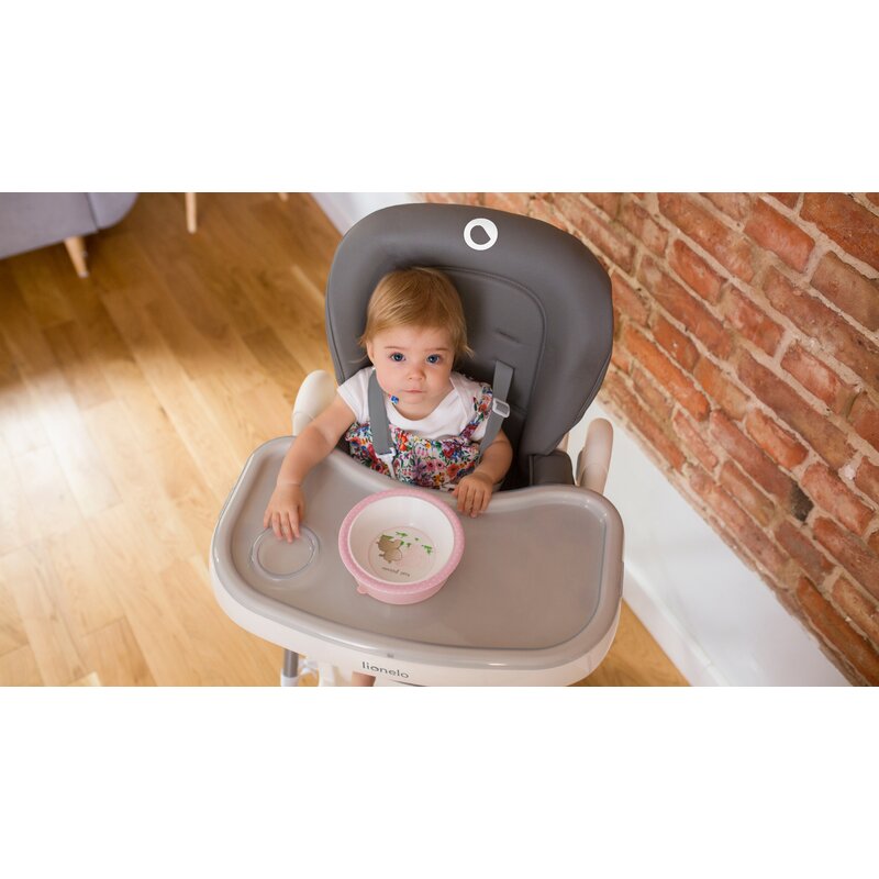 Setul Lionelo Linn Plus include o tava dubla reglabila, a carei strat exterior poate fi detasat si spalat in masina de spalat vase. Tapiteria din eco-piele face ca scaunul sa fie rezistent la murdarie, inundare si abraziune. Textura prietenoasa cu pielea a tesaturii asigura o curatare usoara cu un servetel umed. Scaunul inalt este livrat cu un cos spatios pentru accesorii.