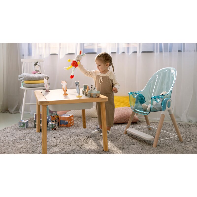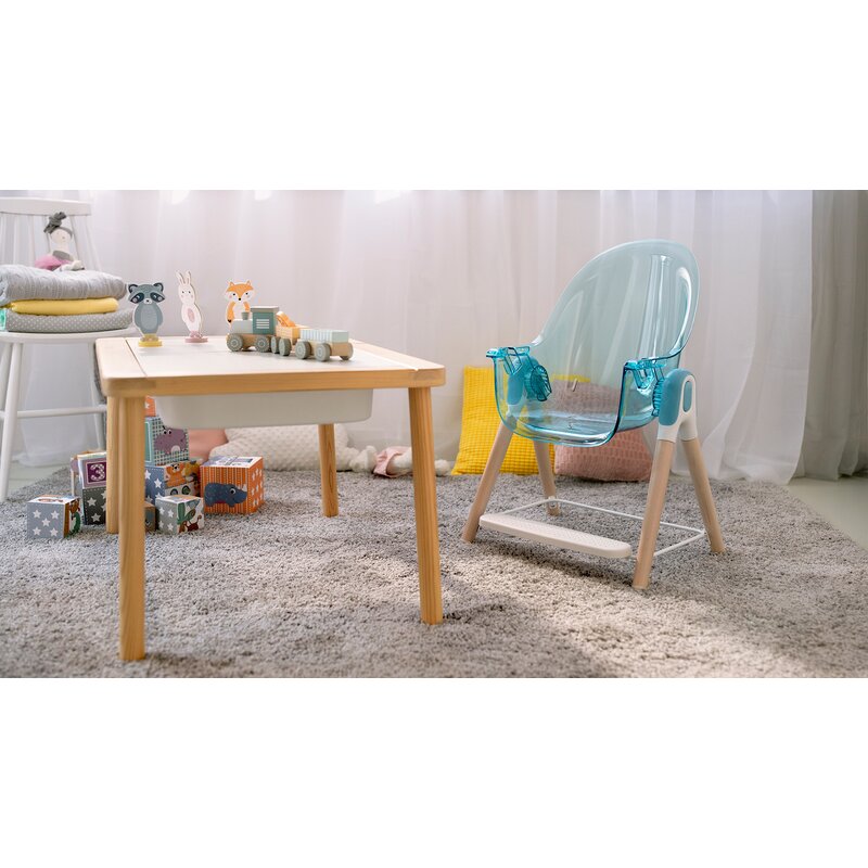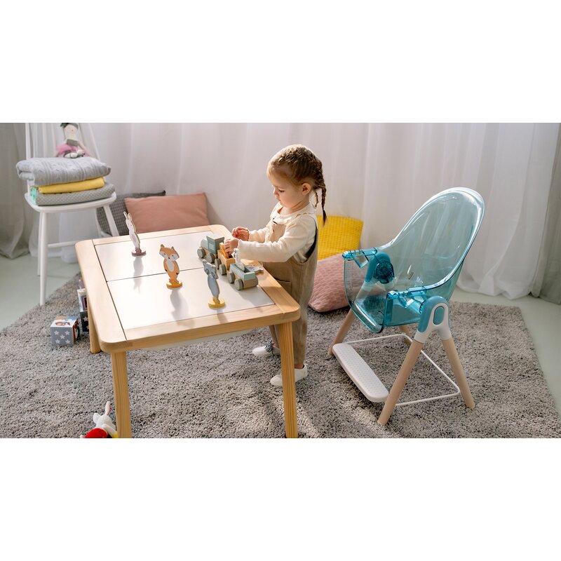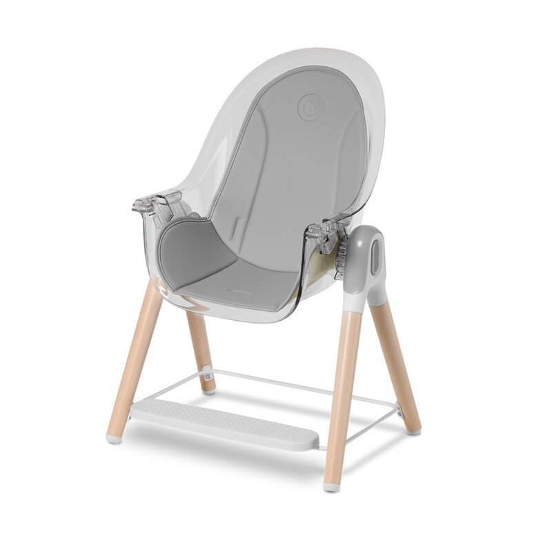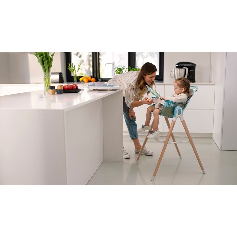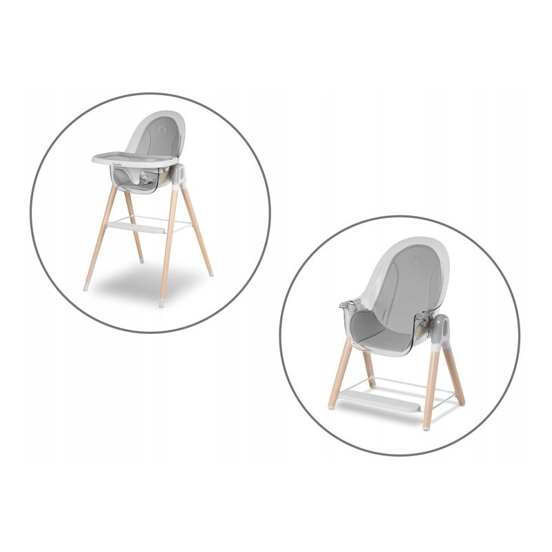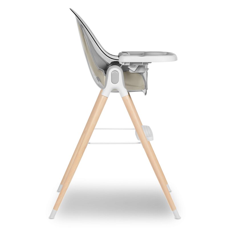 Structura solida a produsului este realizata din lemn de fag durabil, otel si policarbonat. Structura modulara a mobilierului permite transformarea sa eficienta in functie de nevoile bebelusului. Produsul are un spatar conturat ergonomic si un suport pentru picioare care sustine picioarele, care asigura o utilizare confortabila a scaunului pentru copil.