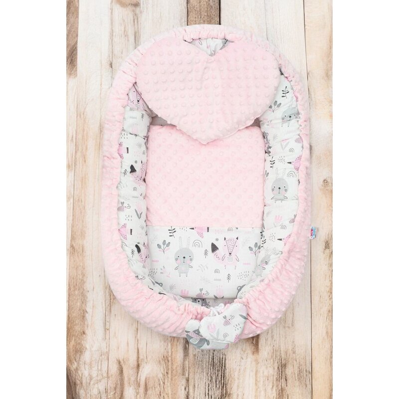 Set 3 piese, New Baby, Luxury, Baby Nest cu doua fete, Cu paturica si pernuta in forma de inima, Minky Bears Pink