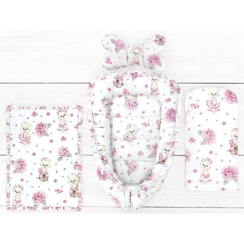 Set 4 in 1 Cosulet bebelus, MimiNu, Baby Cocoon 75x55 cm, Husa bumbac, Din bumbac certificat Oeko Tex Standard 100, Cu paturica 50x70 cm, Cu salteluta, Cu perna fluture, Design, Pink Ballerina