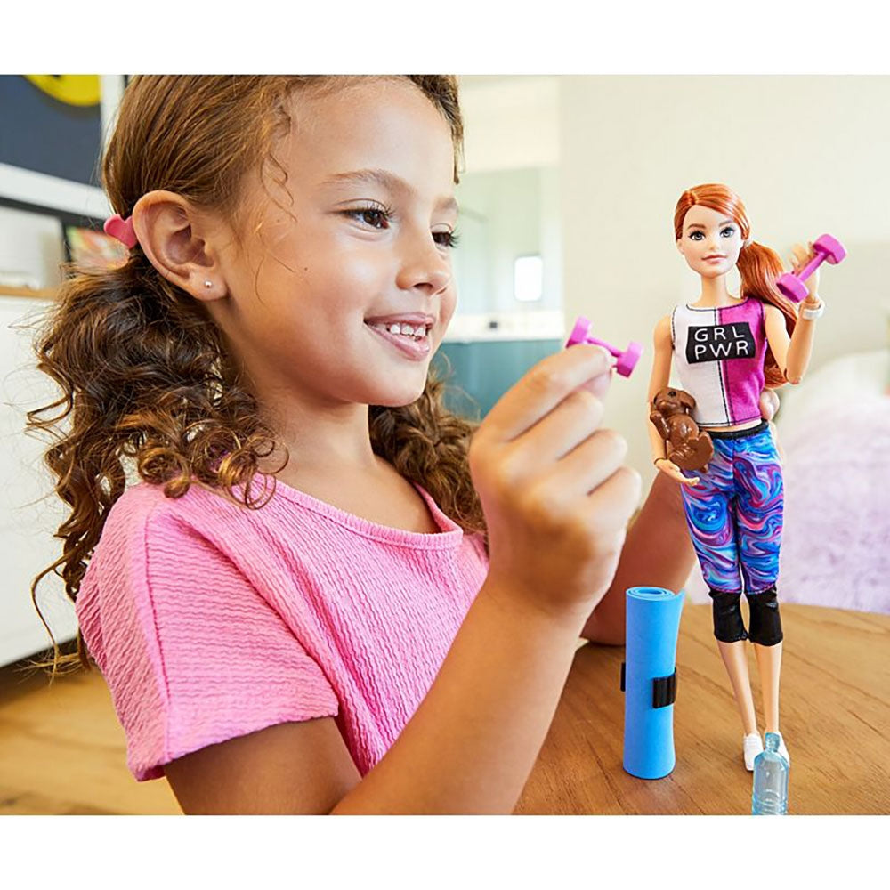 - Papusa Barbie este gata sa se antreneze si sa se mentina in forma cu piese care includ un covoras de yoga cu curea, hula hoop, ceas, sticla de apa, in plus, ea poate transporta cateva dintre articolele din geanta ei de gimnastica