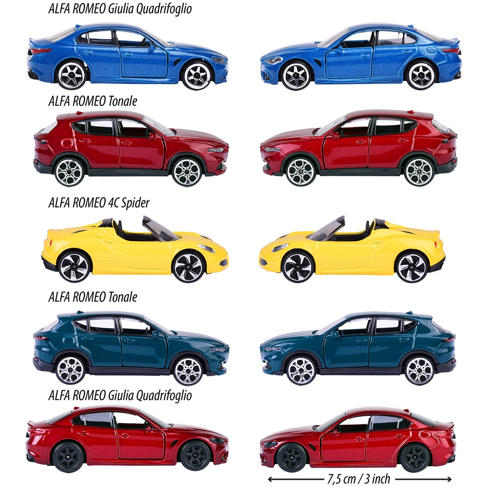 - Setul include: Alfa Romeo Giulia Quadirifoglio in rosu, Alfa Romeo Giulia Quadirifoglio in albastru, Alfa Romeo 4C Spider in galben, Alfa Romeo Tonale in verde, Alfa Romeo Tonale in rosu