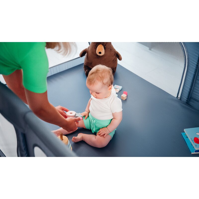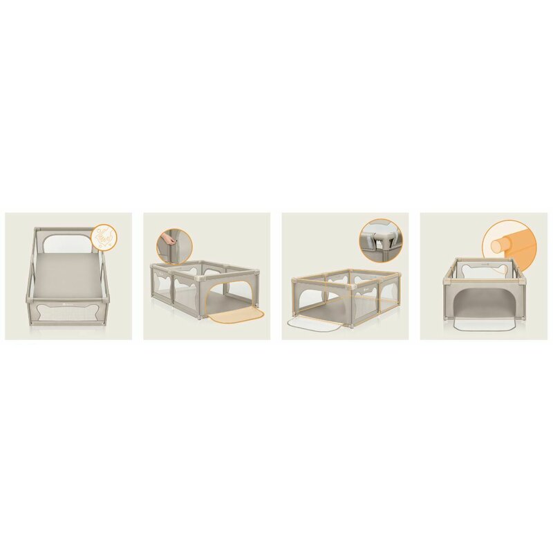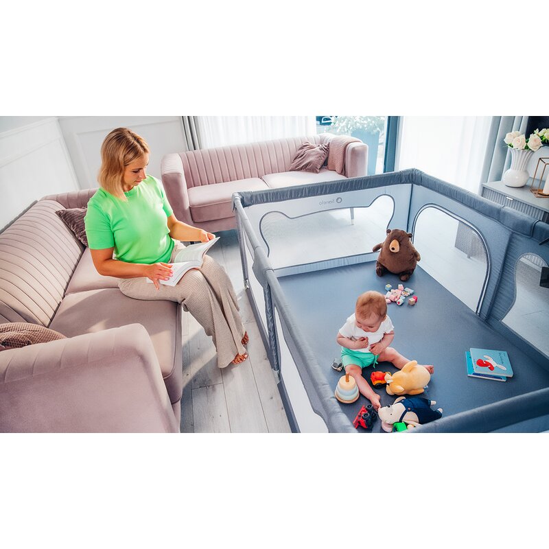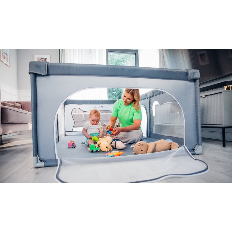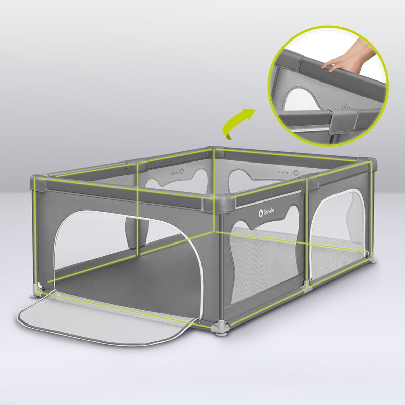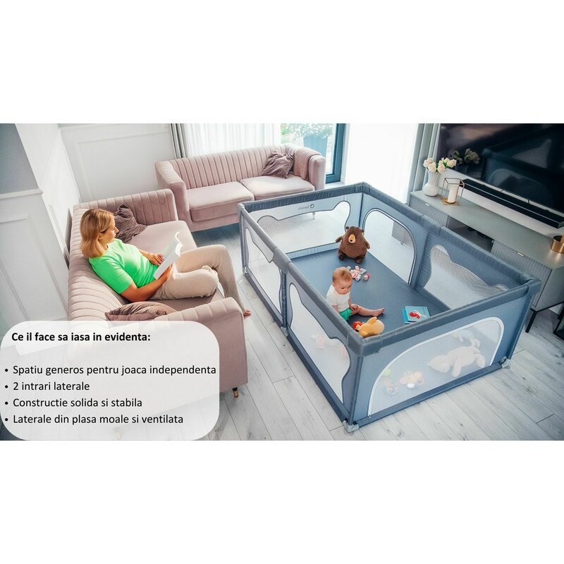 - Zona de joaca inchisa creeaza un mediu curat si sigur pentru copil, cu laturi din plasa pentru o vizibilitate usoara.