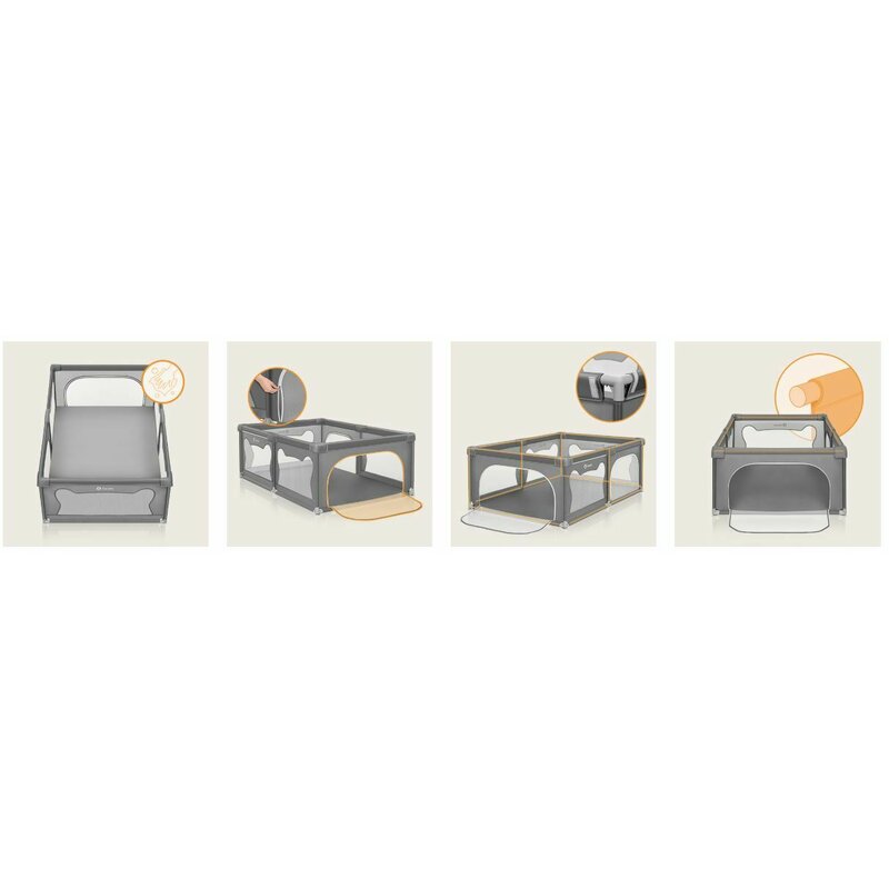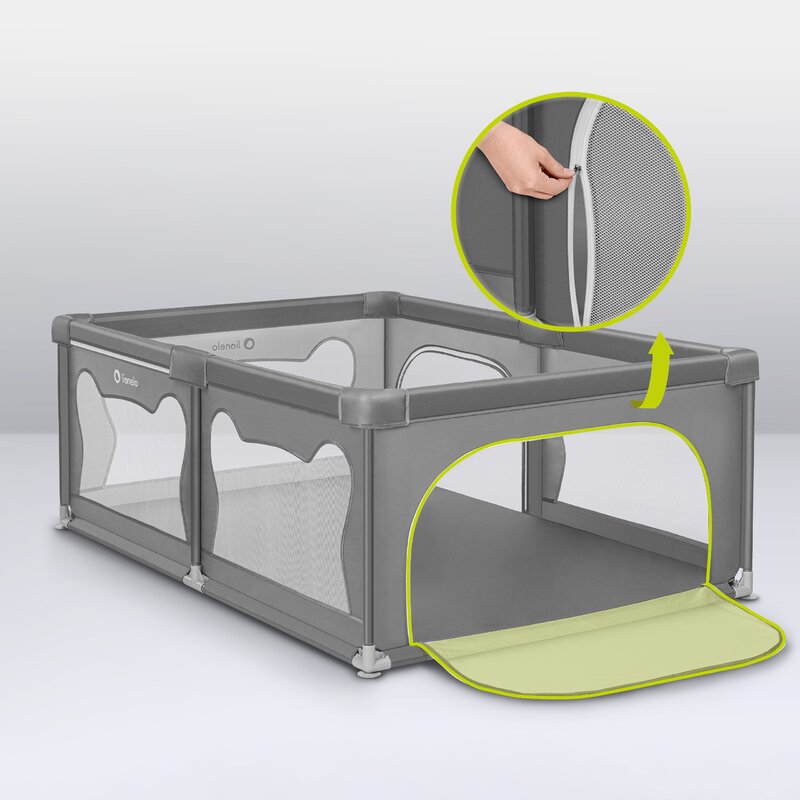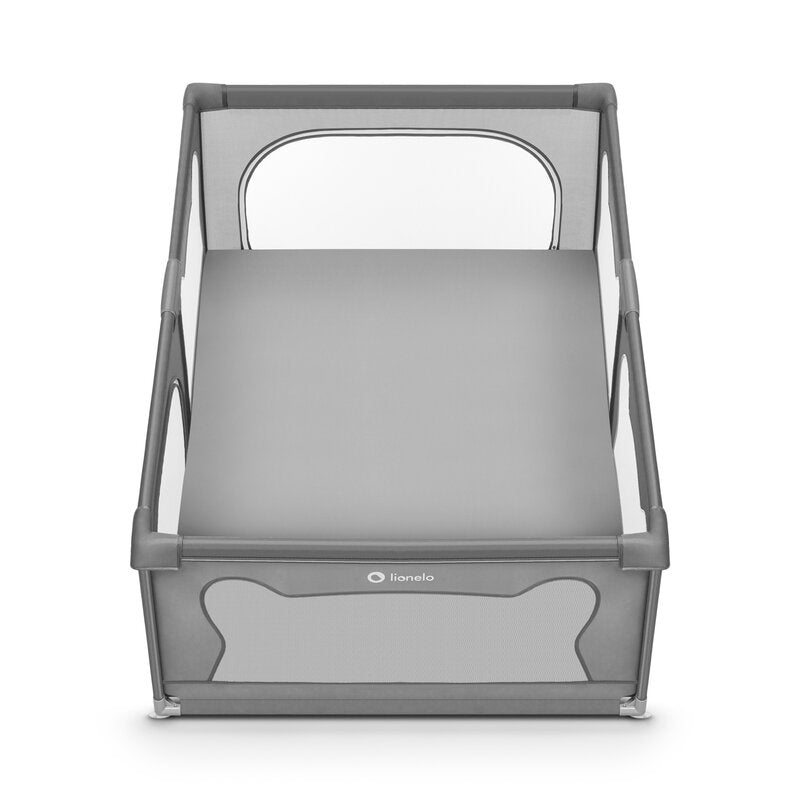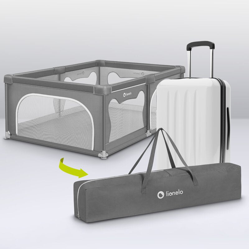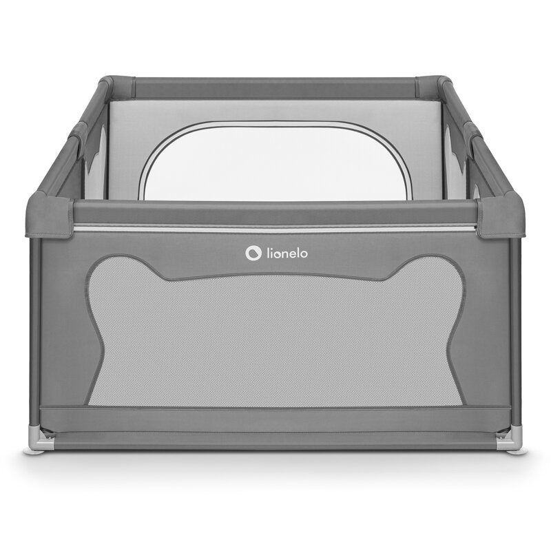 Tarc de joaca copii, Lionelo, Willow, 127 x 187 cm, Pliere compacta, Include geanta de transport, Din plasa, Cu doua intrari laterale si fermoar, Cu ventuze pentru stabilitate, Conform cu EN 12227:2010, Gri