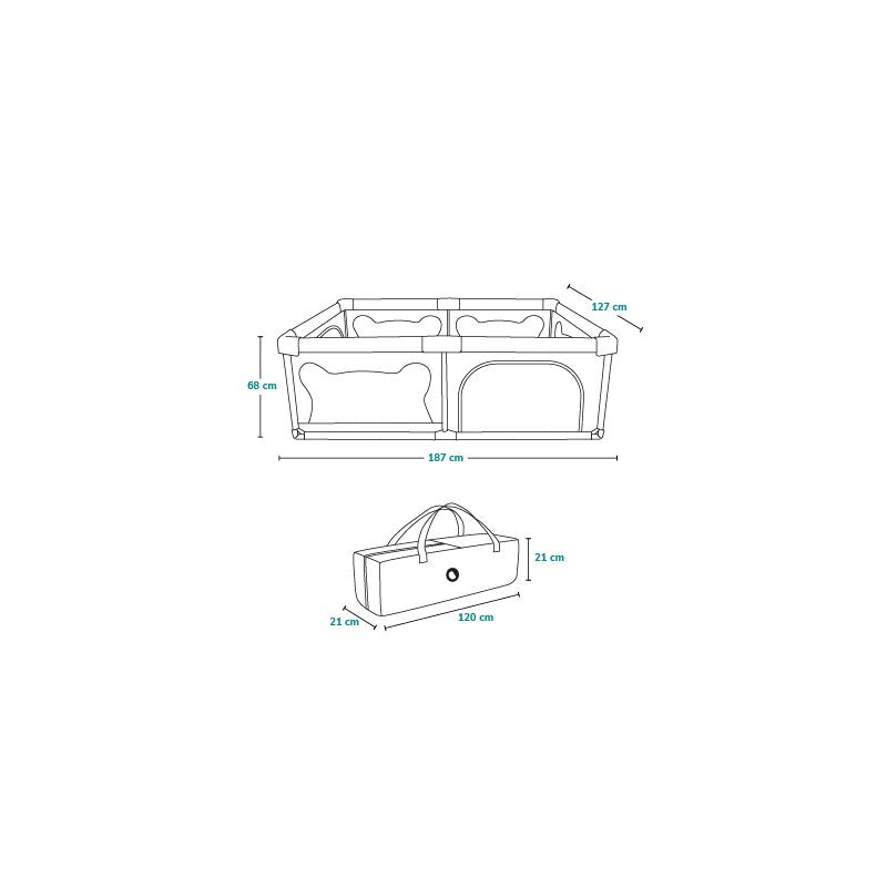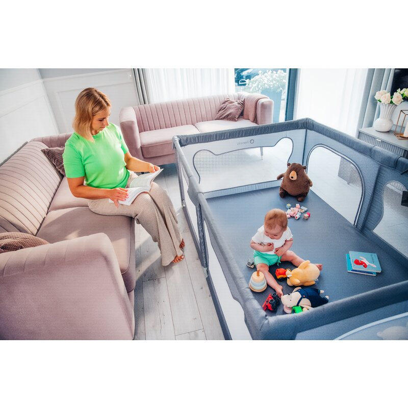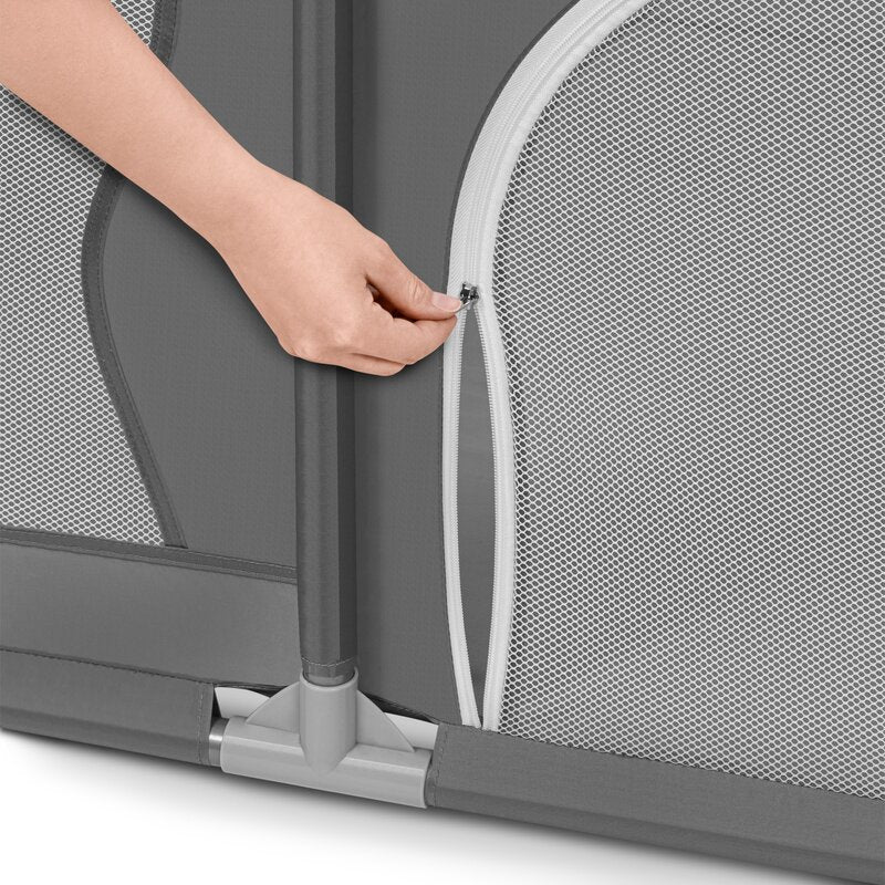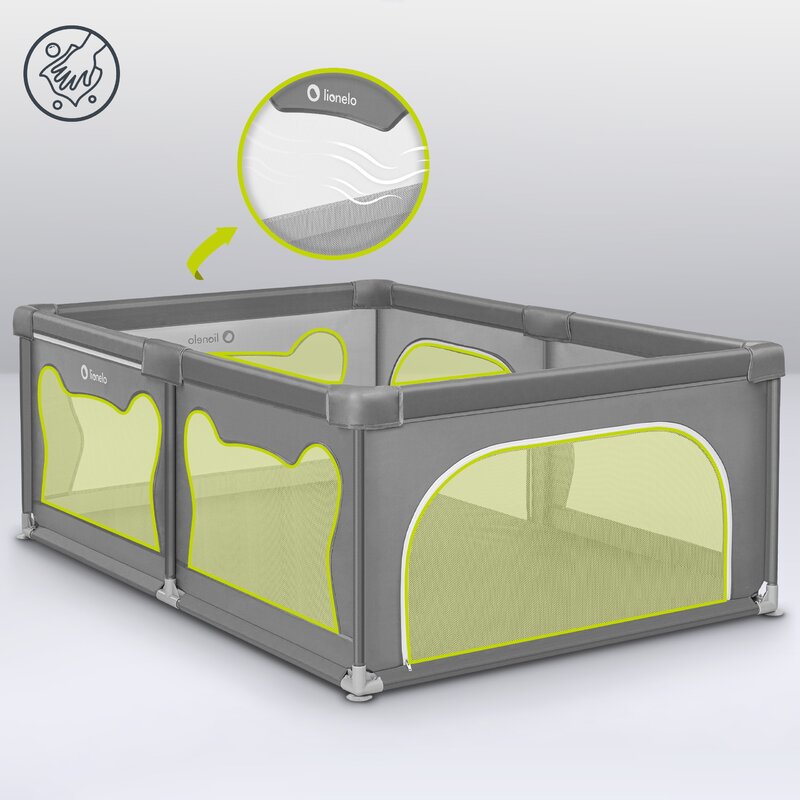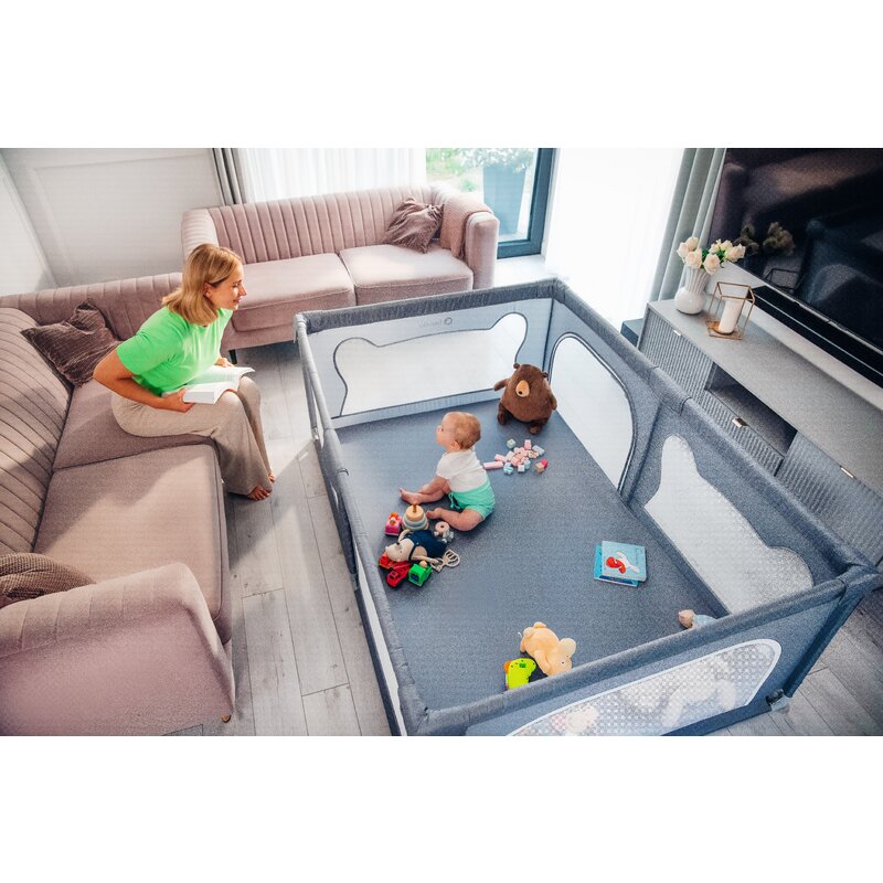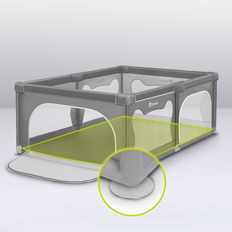 - Zona de joaca inchisa creeaza un mediu curat si sigur pentru copil, cu laturi din plasa pentru o vizibilitate usoara.
